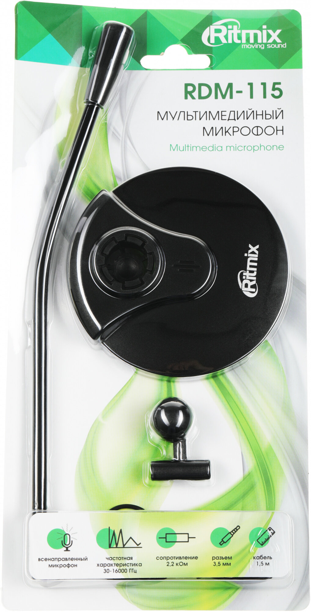 Микрофон RITMIX RDM-115 Настольный микр-н с подвиж-м осн,Регулировка угла наклона,Тип микрофона: конденс,Напр-ть: всенапр-й,Част хар-ка:30-16000 Гц,Сопр:2,2 кОм,Чув-ть:-58 дБ +/-3 дБ,Напр-е:4.5 В,Отн-е сигнал/шум:60 дБ,Разъем:3.5 мм,Кабель: 1.5 м ± 0.2м