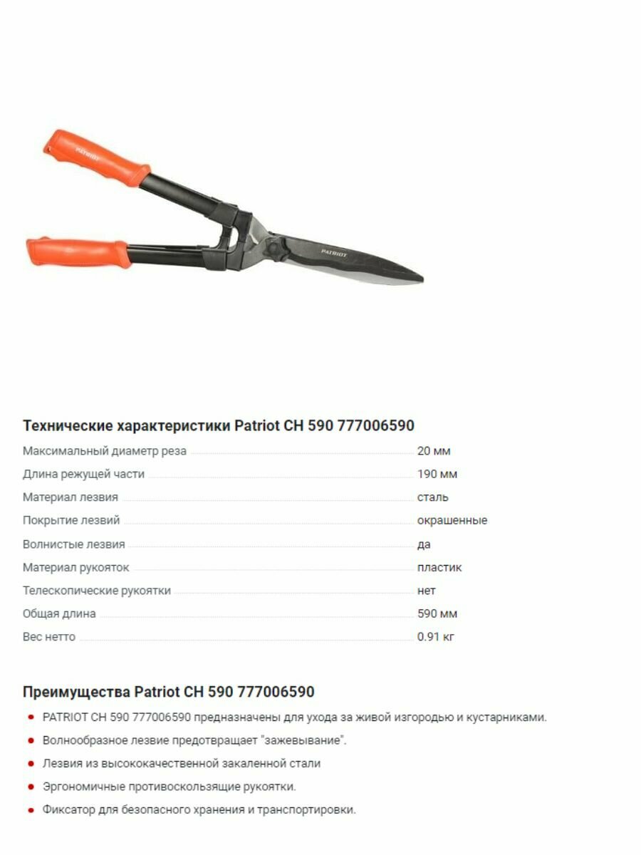 Ниже Вы можете прочитать отзывы на PATRIOT Ножницы для живой изгороди CH 590 777006590, ознакомится с подробными характеристиками, посмотреть интересные обзоры и фотографии на PATRIOT Ножницы для живой изгороди CH 590 777006590.