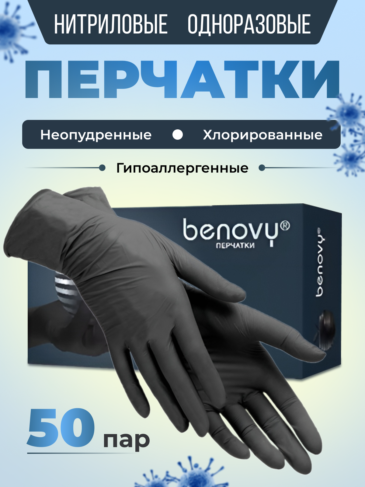 "Перчатки нитриловые Benovy (голубые), L, 100 шт/50 пар."