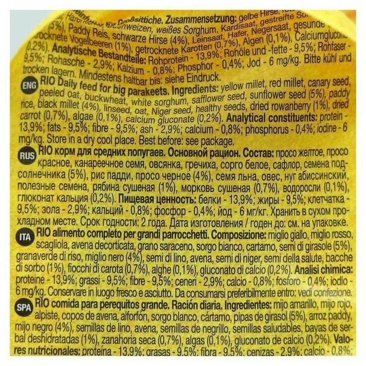 | Плюсы: | Раньше брали импортный корм, в связи с его отсутствием решили попробовать Rio. Первое - корм питомцам понравился. Второе - чистый, нет пыли и мусора. Третье - ничуть не хуже импортного, сбалансирован хорошо. Попугайчики ( у нас волнистый чех и корелла ) кушать стали сразу, не капризничали. В общем они довольны. Ну и мы рады и довольны, что справились с импортозамещением в рационе наших маленьких друзей. |