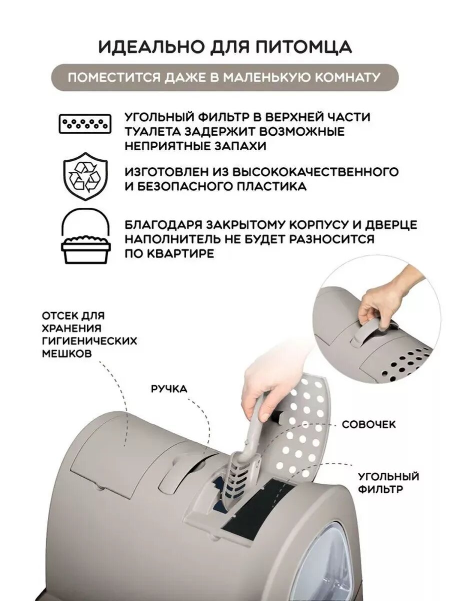 | Отзыв: | Очень симпатичный кошачий туалет, хорошо впишется в любой интерьер, можно поставить даже на видное место)за счёт закрытого типа и наличия фильтра запах фекалий практически не чувствуется, наполнитель выносится на лапах минимально, но это зависит ещё от самого наполнителя(у меня есть коврики с сотами, которые собирают все частицы). Цвет, к сожалению, не передаётся на фото в точности, он серо-коричневый. Соотношение цена/качество идеальные. 100% рекомендую |