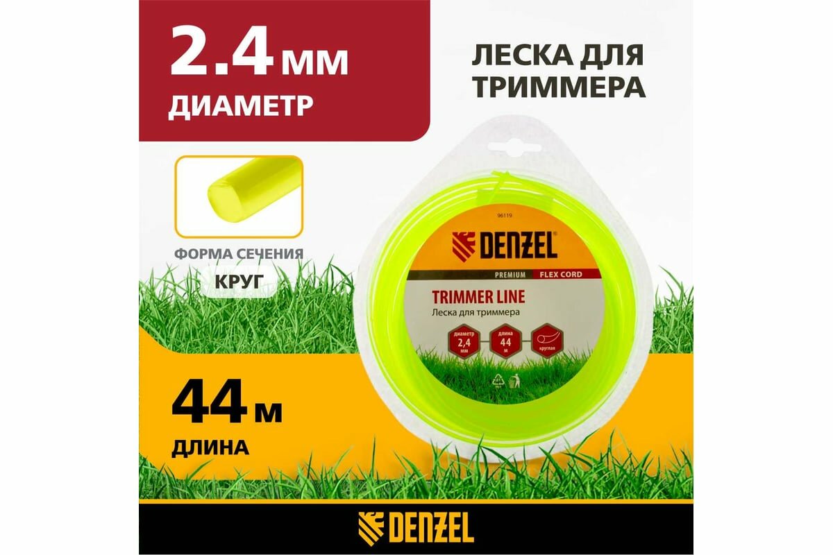 Леска для триммера (DENZEL Леска для триммера круглая 2,4 мм х 44 м, блистер FLEX CORD 96119)