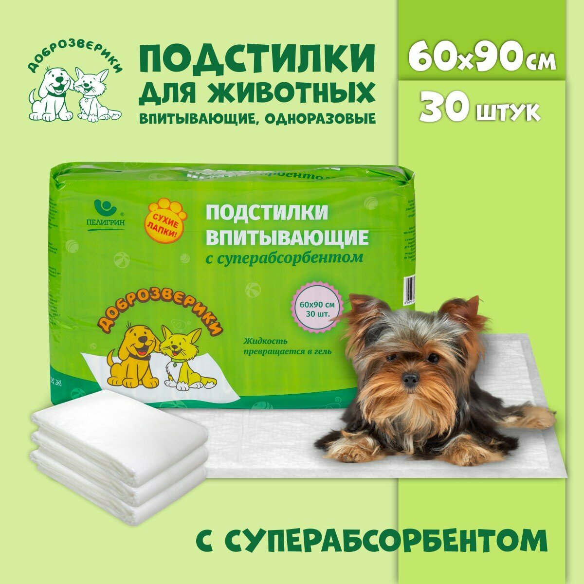 Доброзверики подстилки впитывающие для животных с суперабсорбентом 60х90 см, 30 шт. "Сухие лапки"