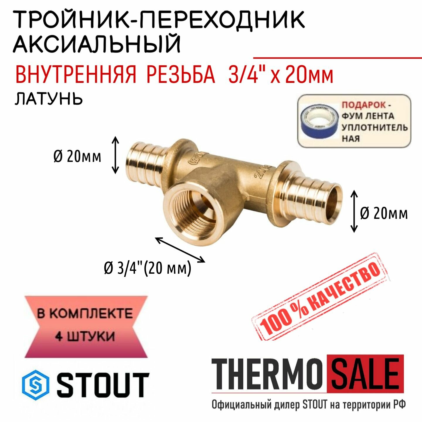 Купить Тройник-переходник с ВР 20xR 3/4" 4 шт для труб из сшитого полиэтилена аксиальный ФУМ лента