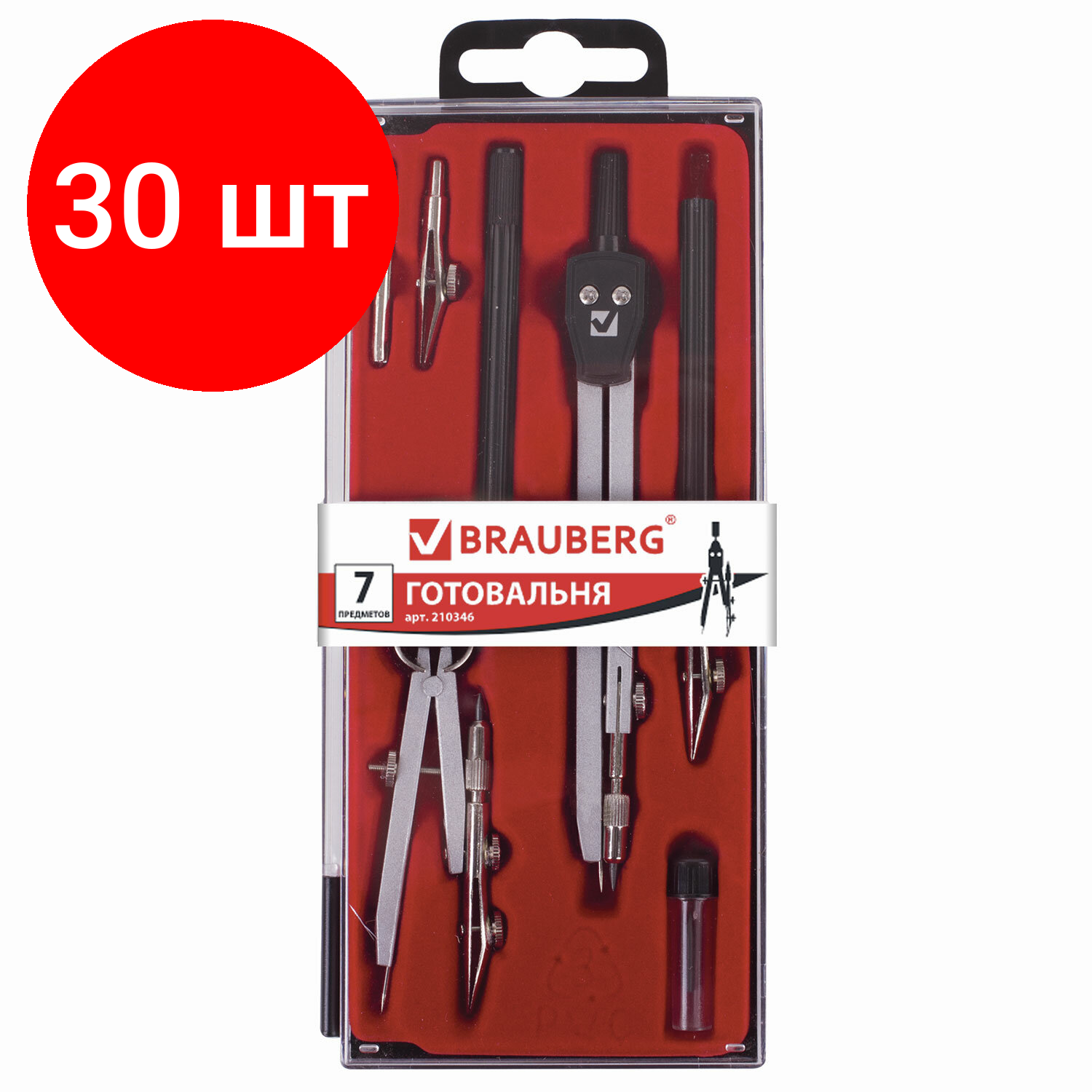 Купить Комплект 30 шт, Готовальня BRAUBERG "Architect", 7 предметов: циркуль + кронциркуль с рейсфедором, рейсфедер + держатель, 2 вставки, грифель, 210346