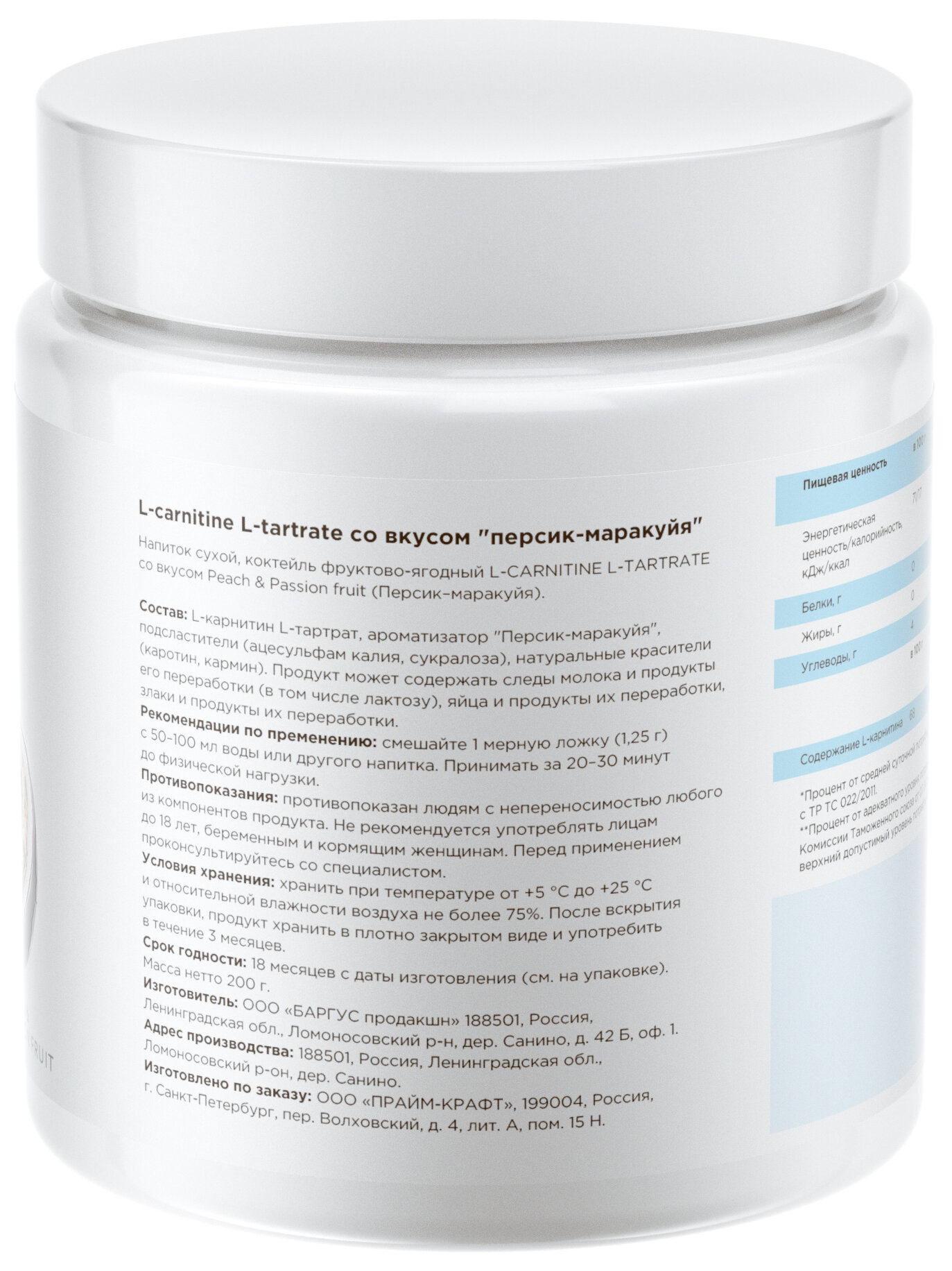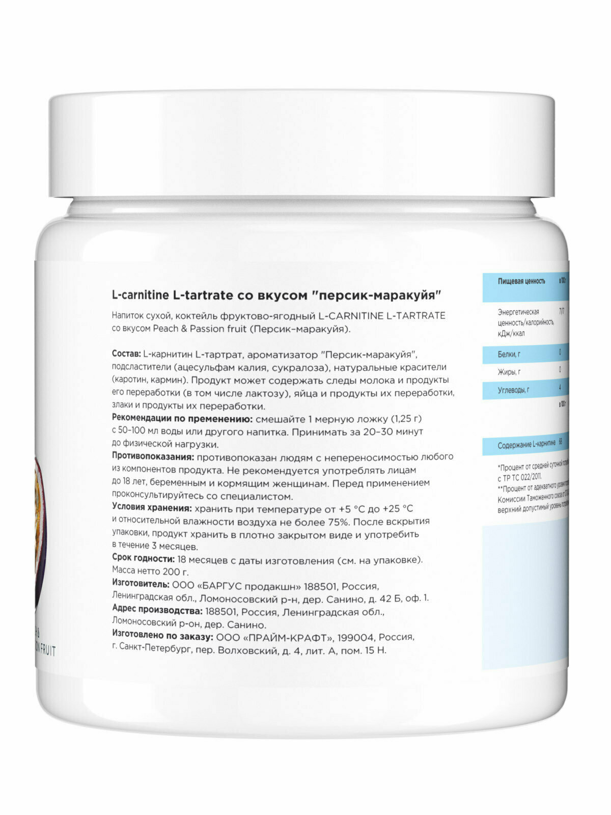 Prime Kraft L-карнитин L-Tartrate, 200 гр., персик-маракуйя