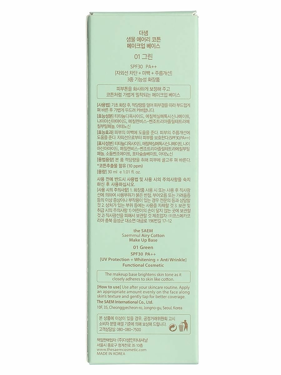 Купить The Saem Скрывающая покраснения база под макияж 30 мл Saemmul Airy Cotton Make Up Base 01 Green