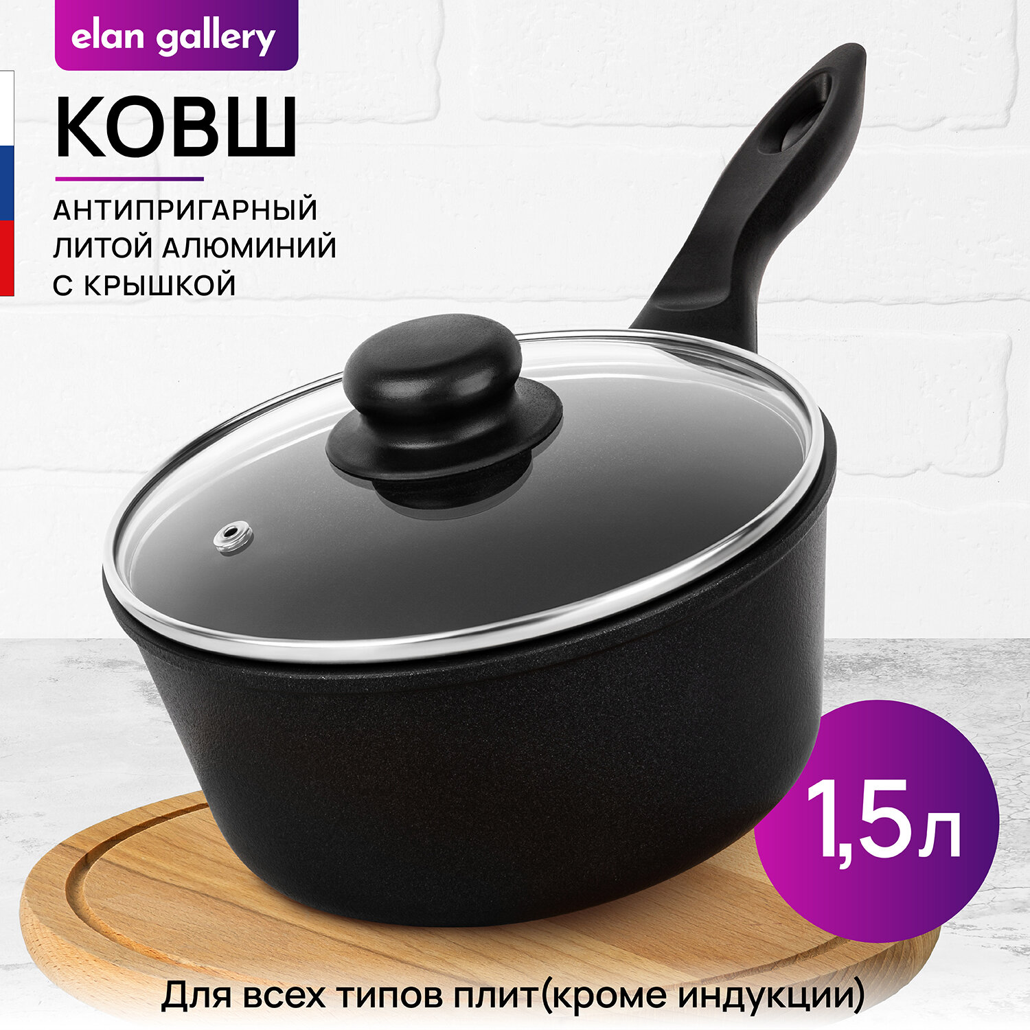 Ковш 1,5 л Elan Gallery гармония вкуса Черный Оникс с крышкой D18, с несъёмной ручкой