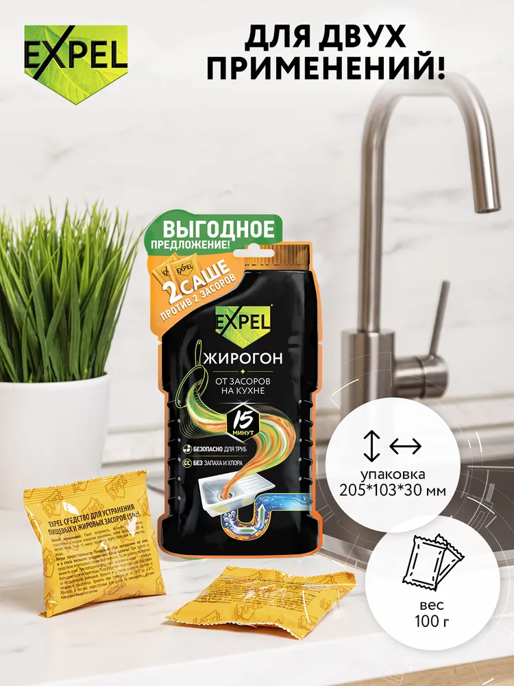 Купить Expel Средство жирогон для устранения пищевых и жировых засоров, 4 упак по 2 саше, 8 засоров