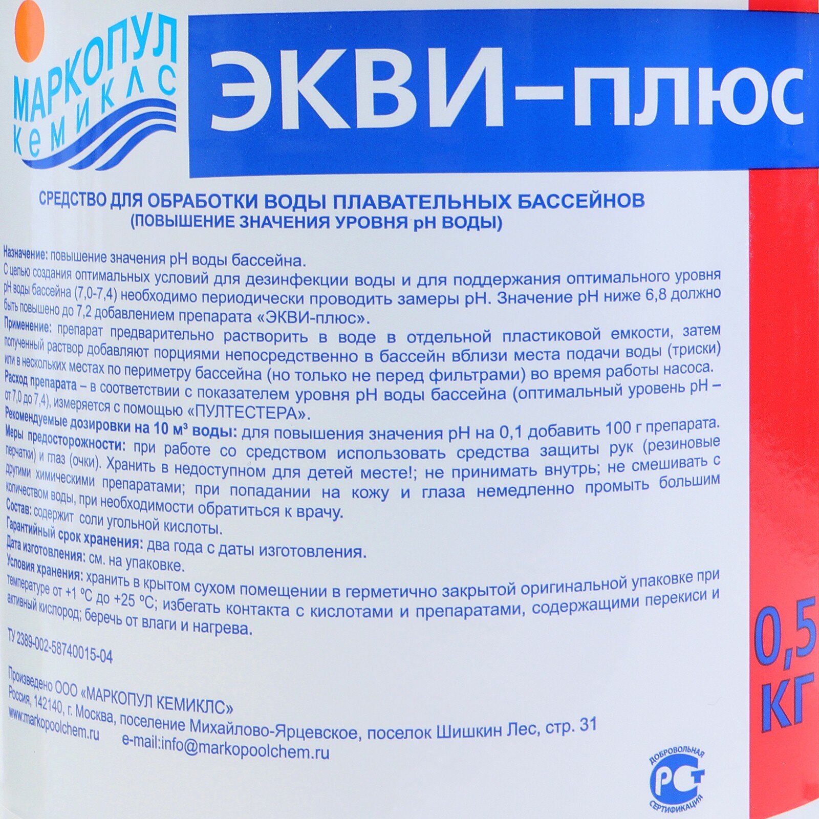 Химия для бассейнов Маркопул Кемиклс Экви-плюс, повышение PH воды, 0,5кг (ХИМ08)