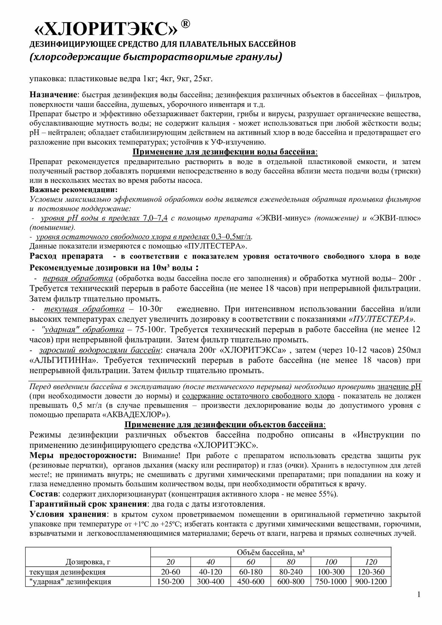 Хлоритэкс МК 1 кг - хлор для бассейна в гранулах