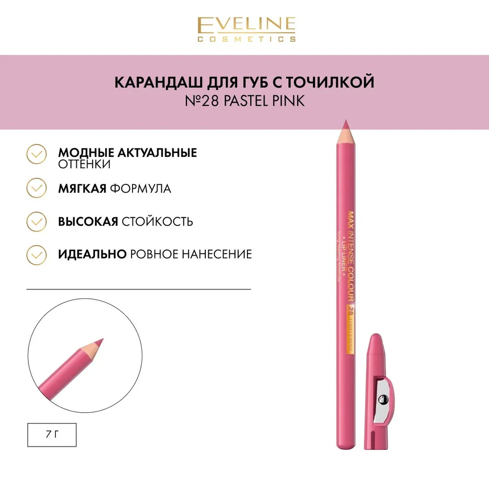 Карандаш для губ EVELINE MAX INTENSE COLOUR контурный с точилкой №28, PASTEL PINK