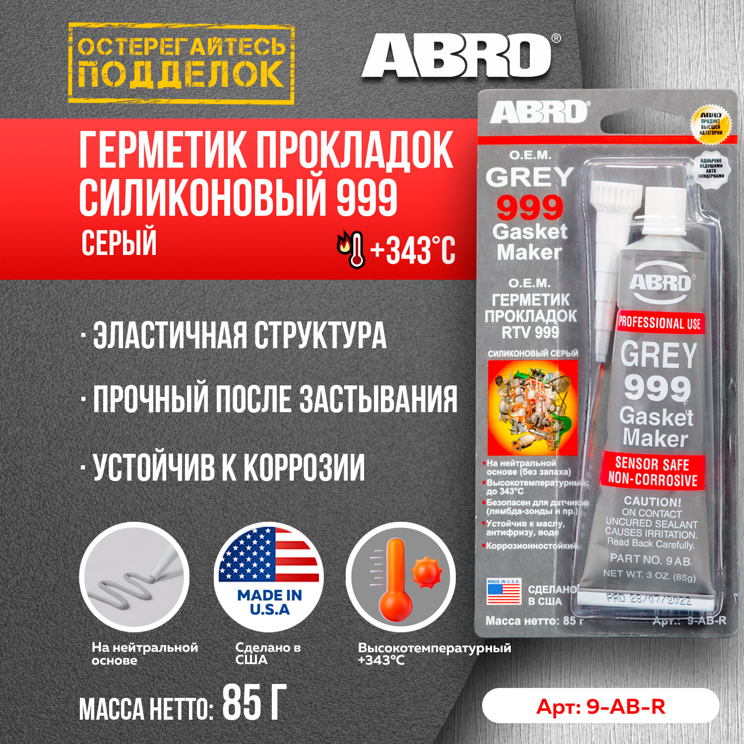 Купить Герметик силиконовый серый 999 85г. (до 260С) 9-AB ABRO США