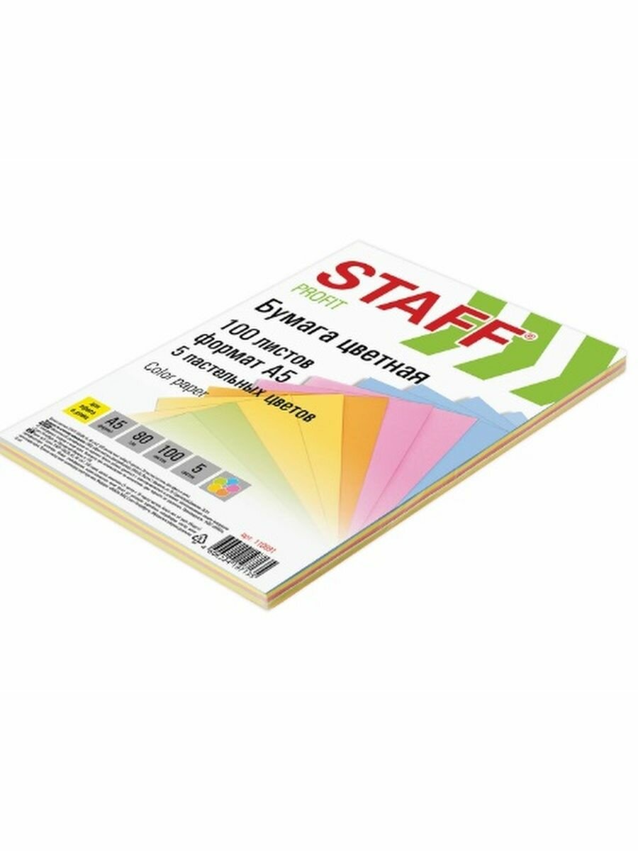 Бумага цветная STAFF "Profit" малого формата (148х210 мм), А5, 80 г/м2, 100 л. (5цв. х 20 л.), цветная пастель, для офиса и дома, 110891, 110891