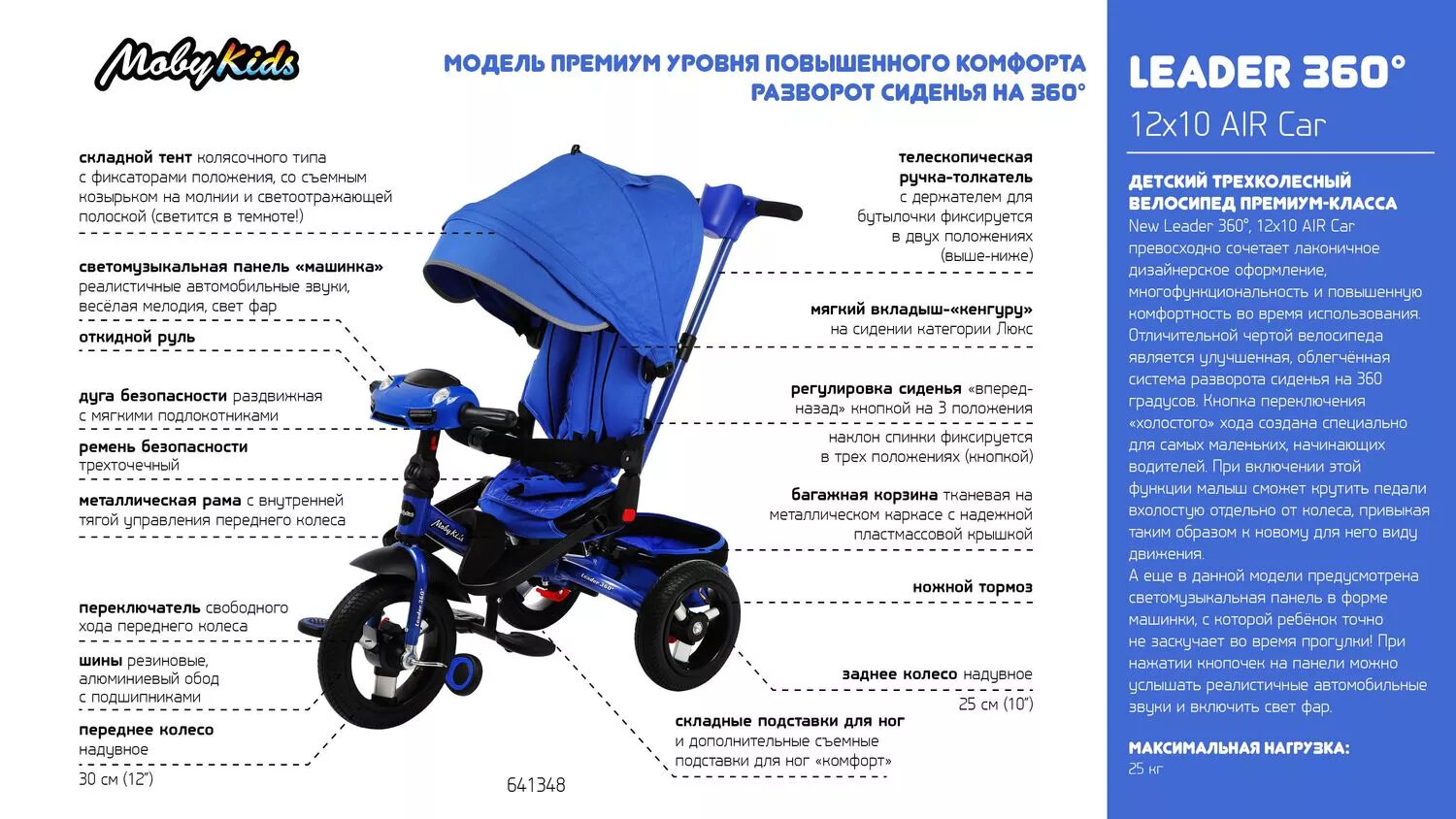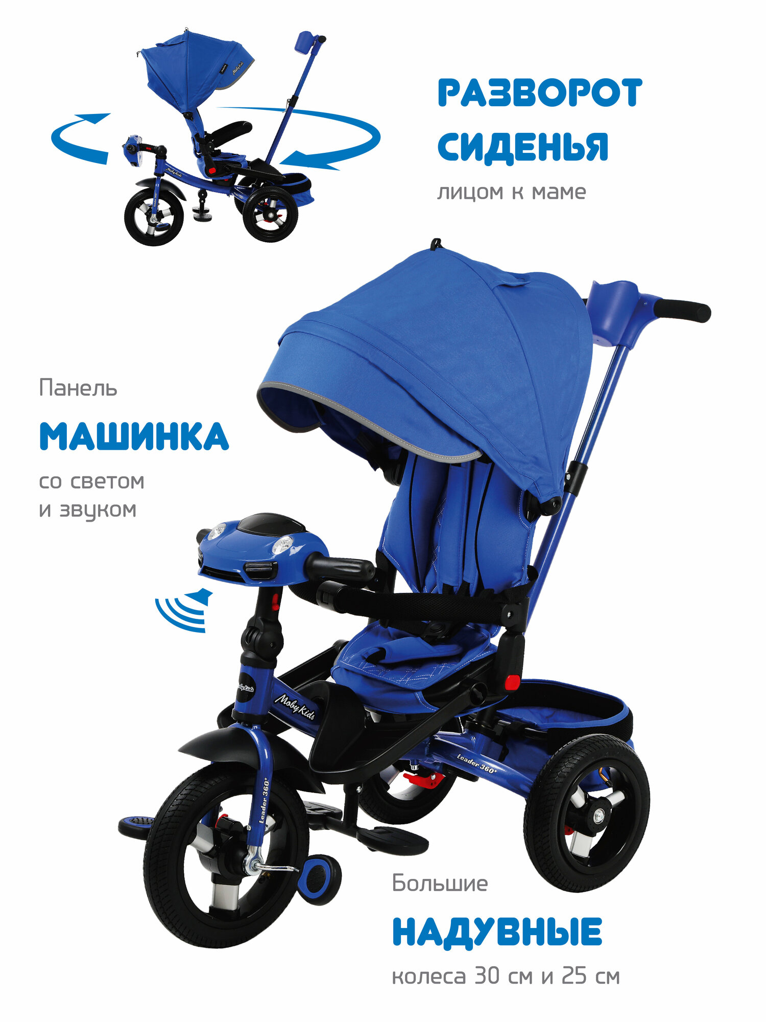 СохранитьТрехколесный велосипед Moby Kids Leader 360° 12x10 Air Car синий 641348 интересное: