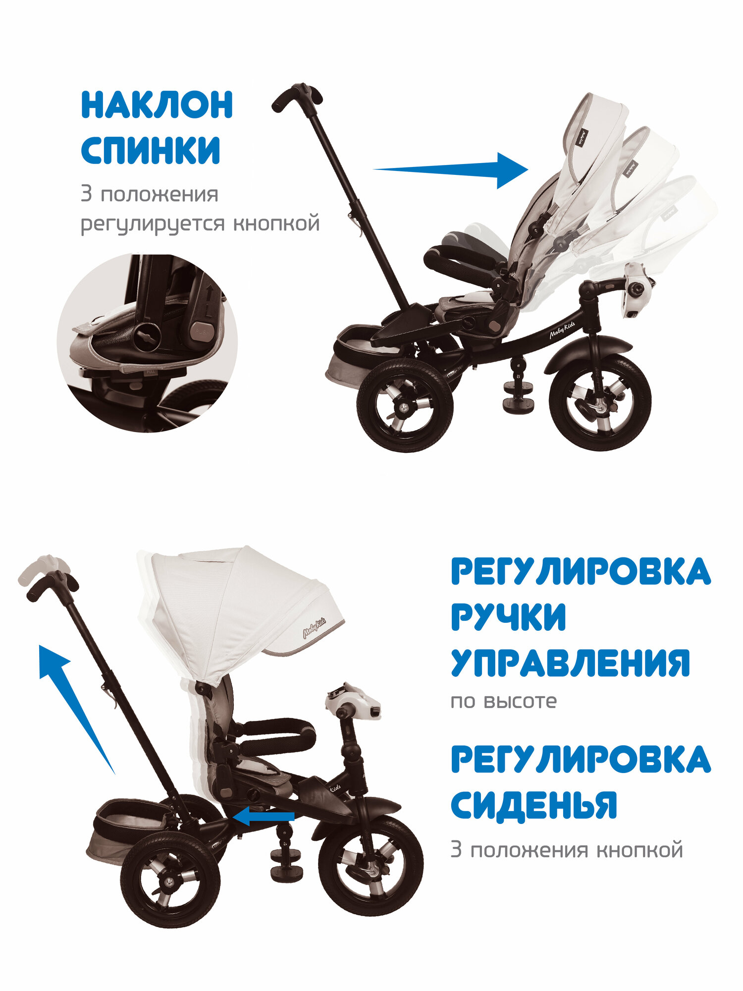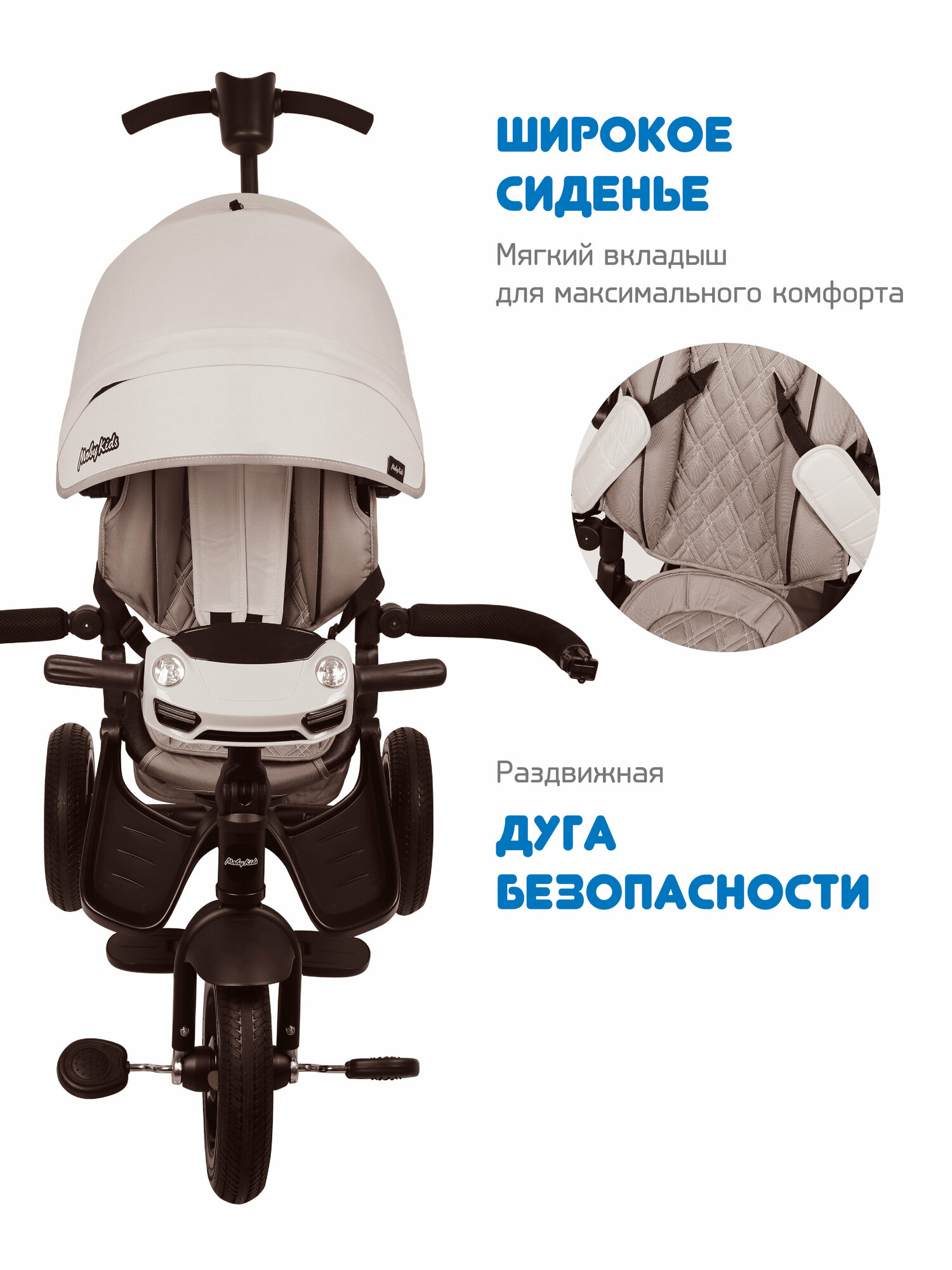 Велосипед трехколесный детский Moby Kids, синий, надувное.кол.12/10",поворотн.сиден, музык.USB,блок,функция свободн.колеса,сумка