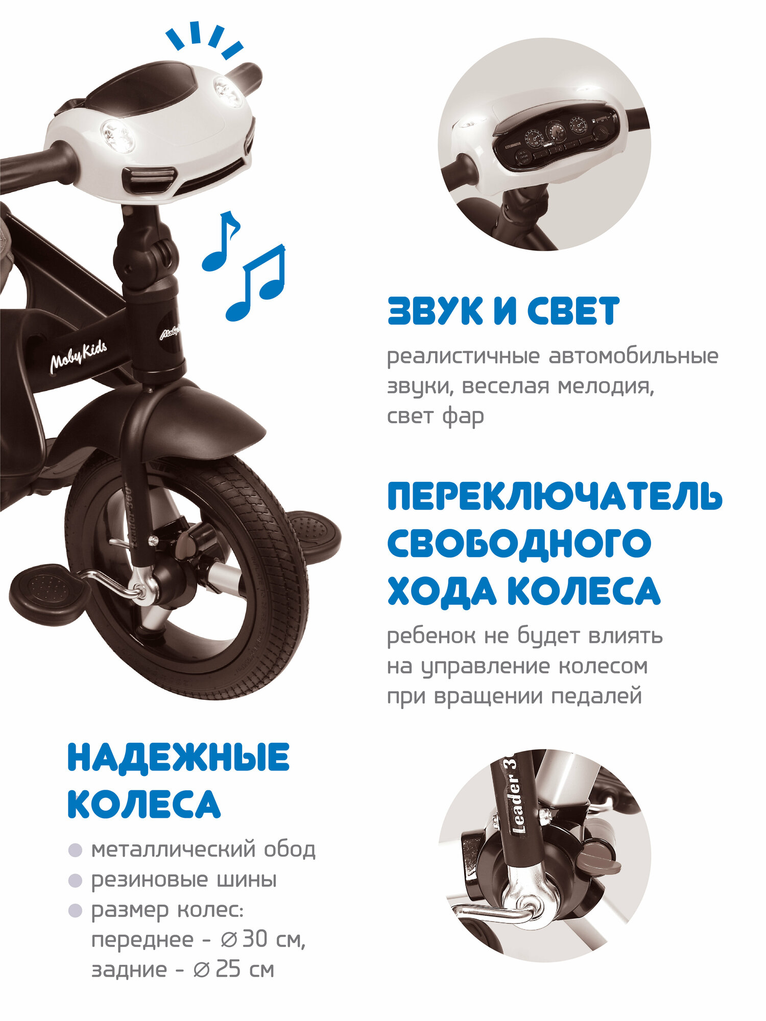 Велосипед трехколесный Moby Kids Leader 360, колеса 12 и 10 дюймов, AIR, черный, экокожа (63127)