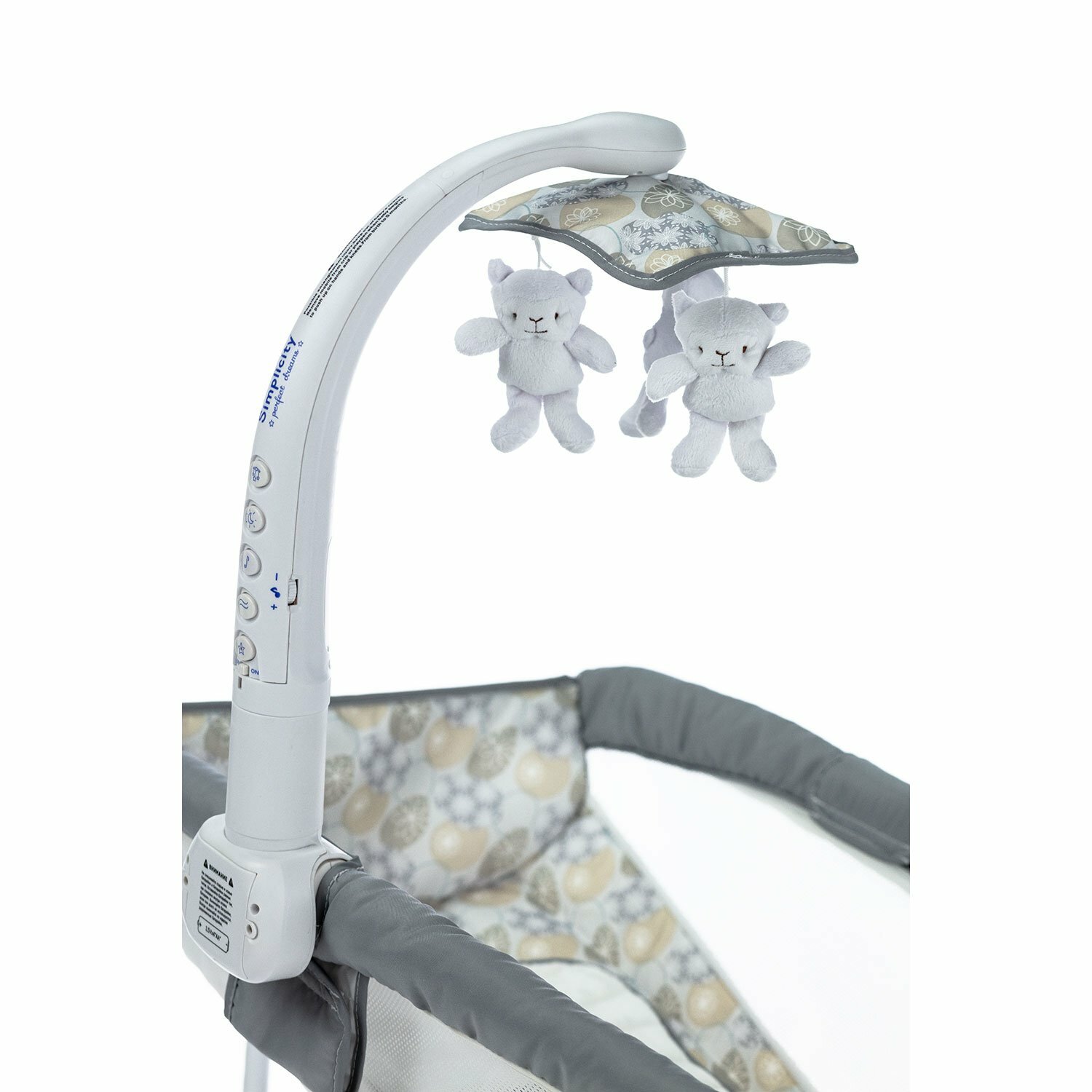 | Плюсы: | безопасная, бортики высокие, мобиль современный, в нем все что нужно, даже игрушки кружатся под музыку, мягкая подсветка (ночник) |