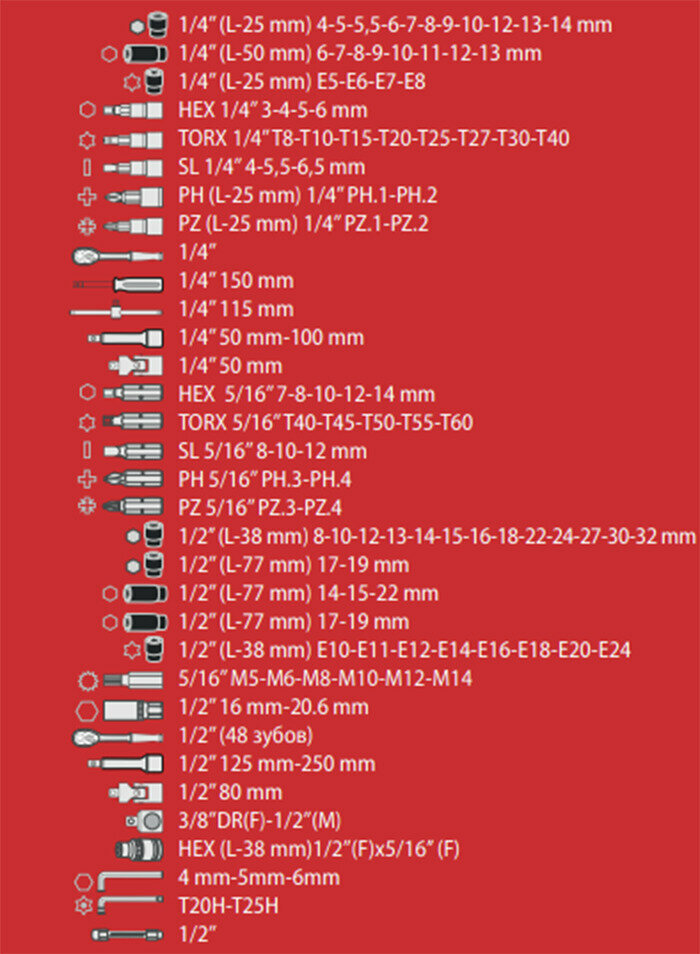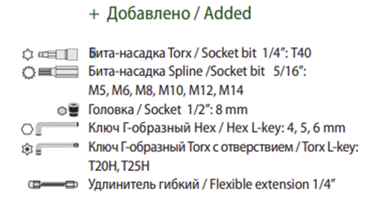 | Отзыв: | Сам ещё не пользовался, но приобрел по совету друга, который испытал на прочность, такой набор и не смог ничего сломать, пока!) Каждый элемент набора - имеет свой артикул, что говорит о подходе производителя. Присутствие "ударных" головок - большой плюс. |