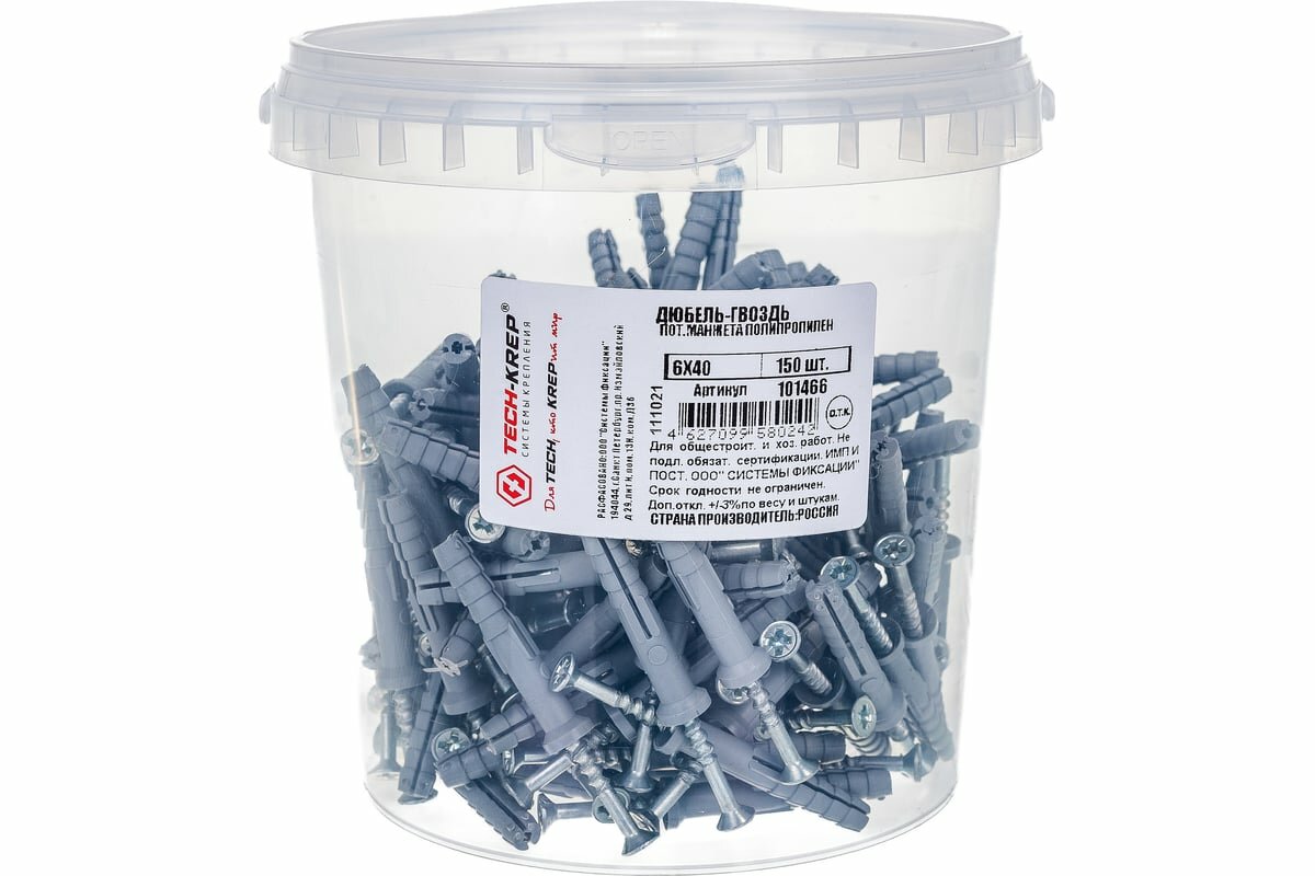 Дюбель-гвоздь 6х40 с потайной манжетой полипропилен (уп.150шт) ведро Tech-Krep 101466 ( 1упак. )