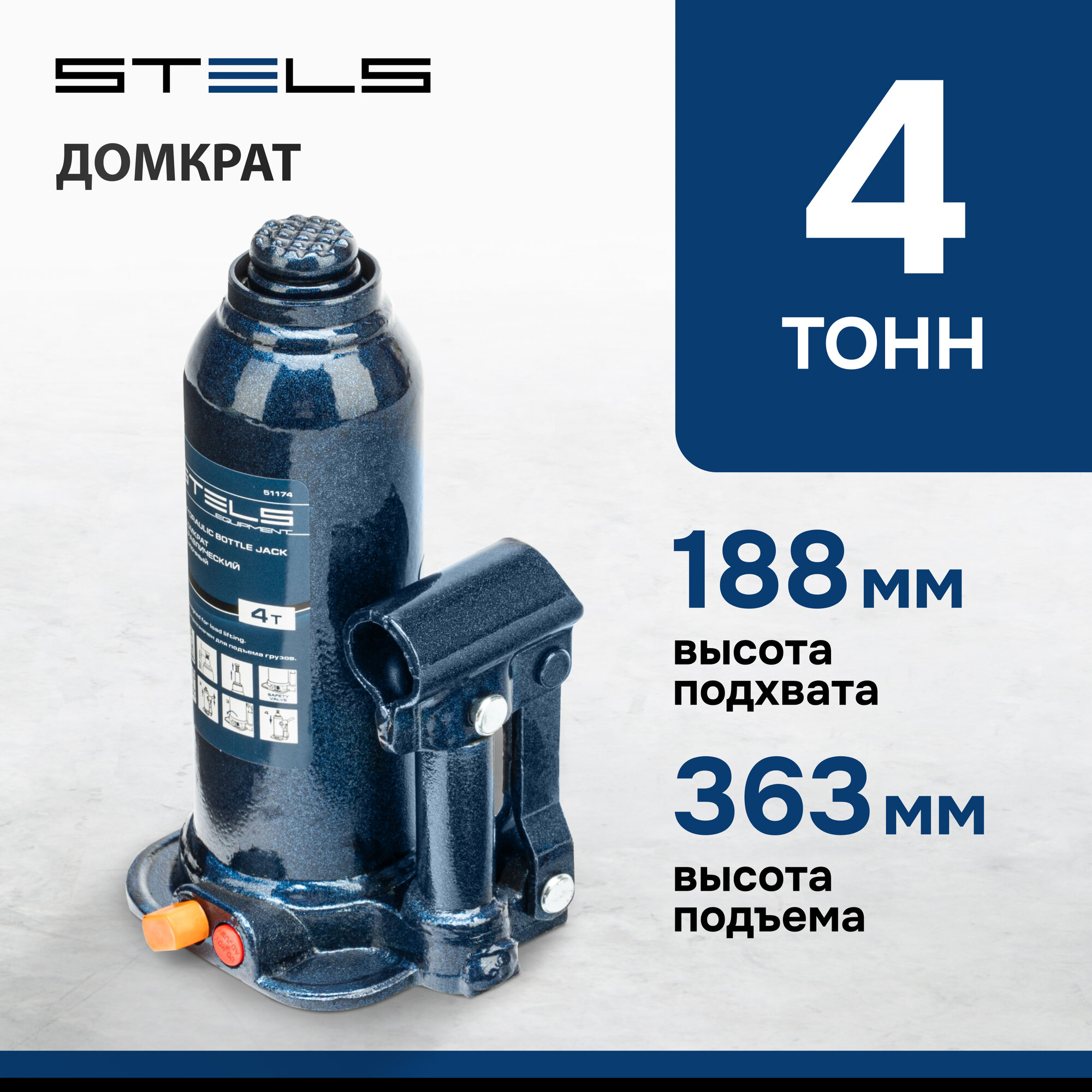 Домкрат гидравлический бутылочный Stels Equipment STELS 4 т, h подъема 188–363 мм, 51174