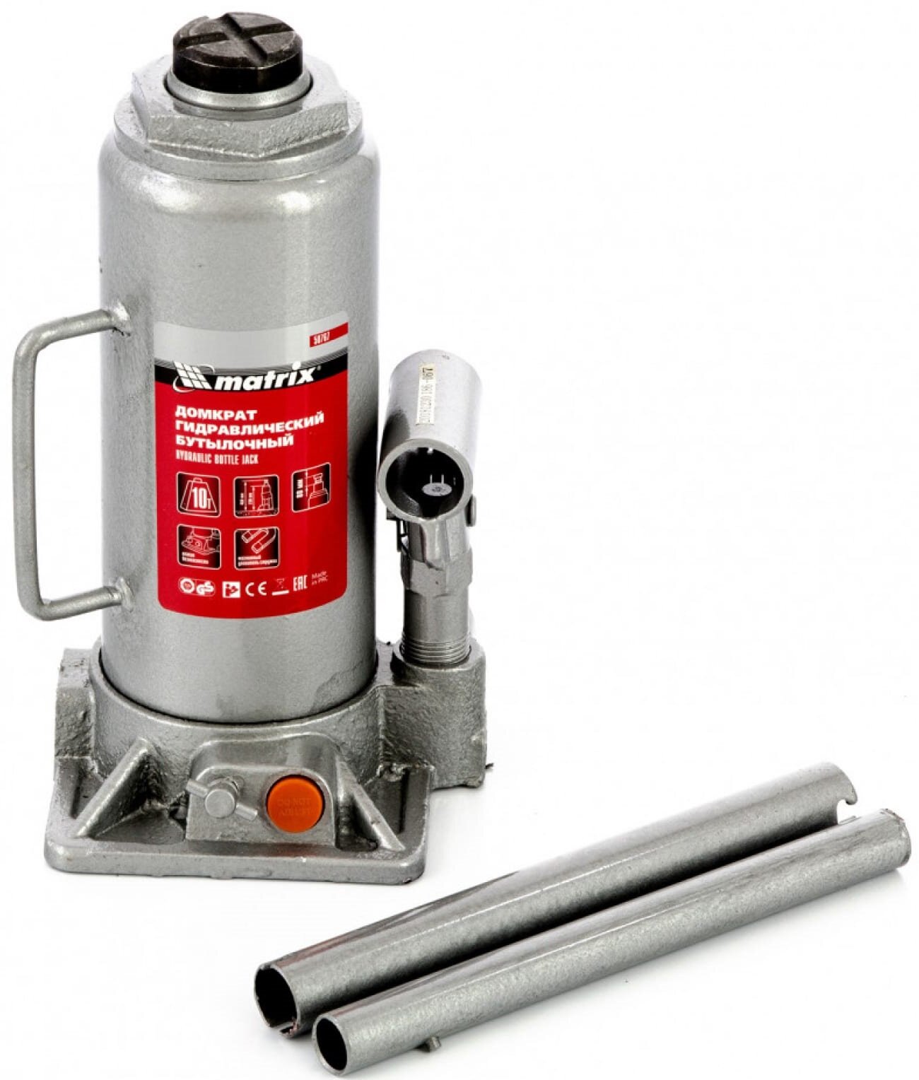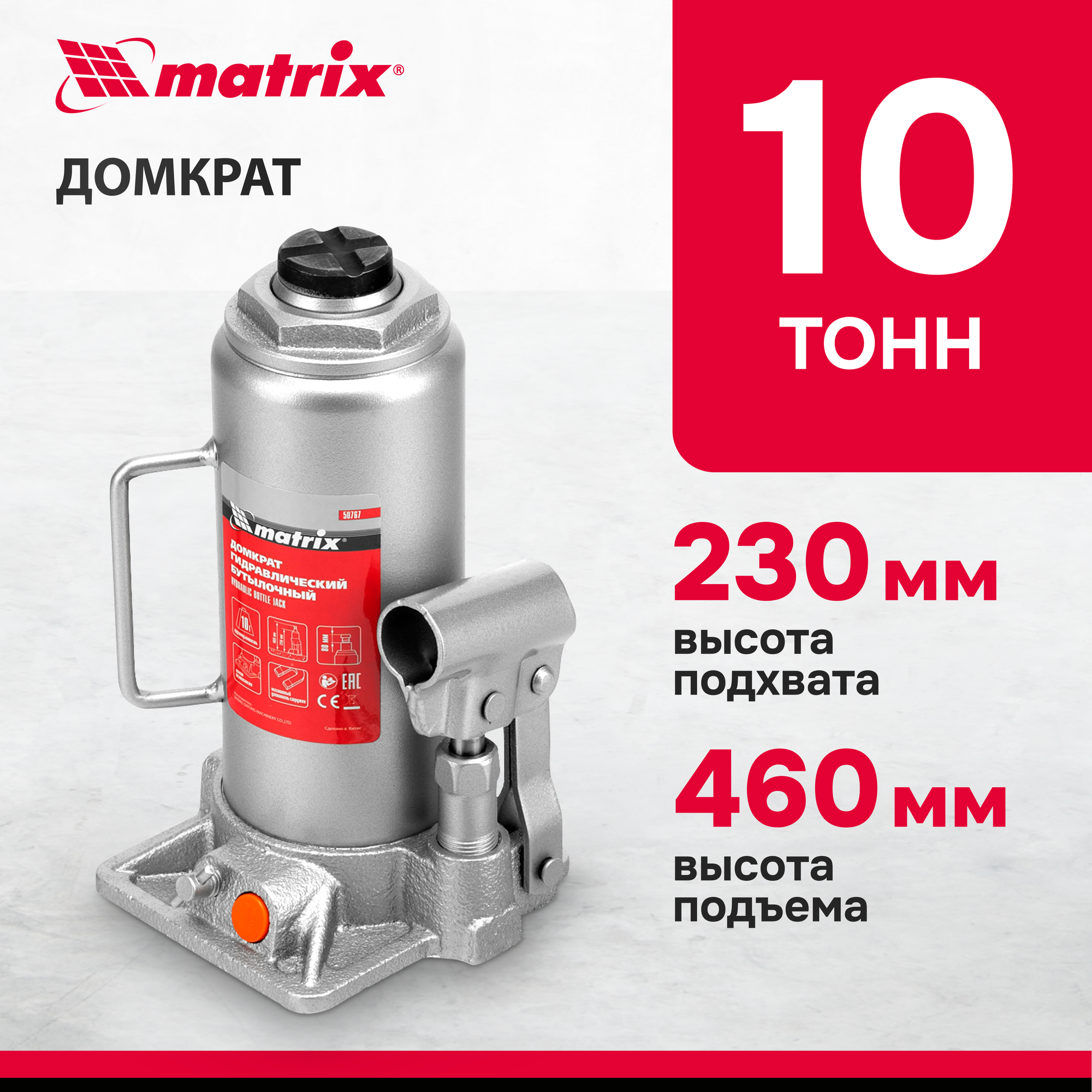 Домкрат гидравлический бутылочный Matrix 50767, 10 т, h подъема 230–460 мм