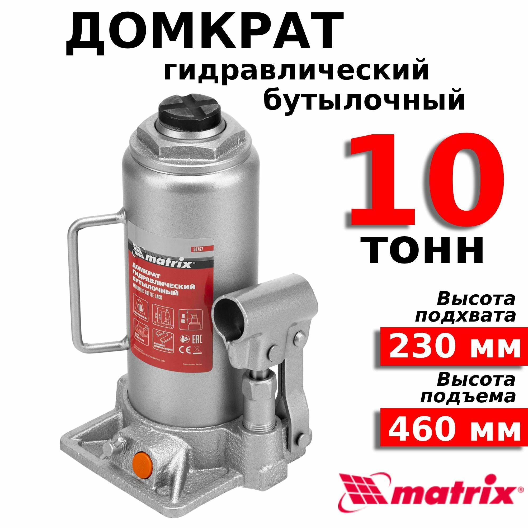 MATRIX Домкрат гидравлический MATRIX 50767, бутылочный, 10 т, высота подъема 230-460 мм