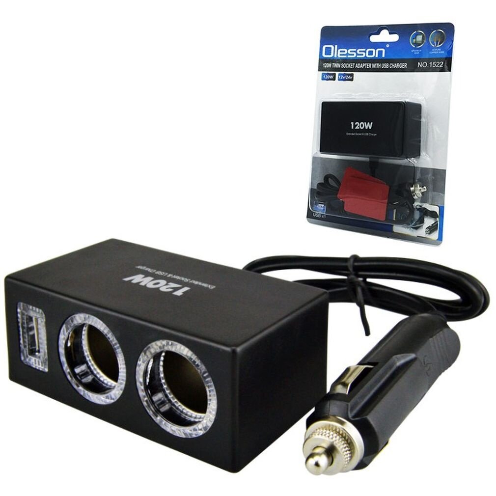 Разветвитель прикуривателя Olesson 12/24В, 2 гнезда, 1xUSB (5В, 1.2А), 120Вт, черный, с подсветкой, арт. 1522