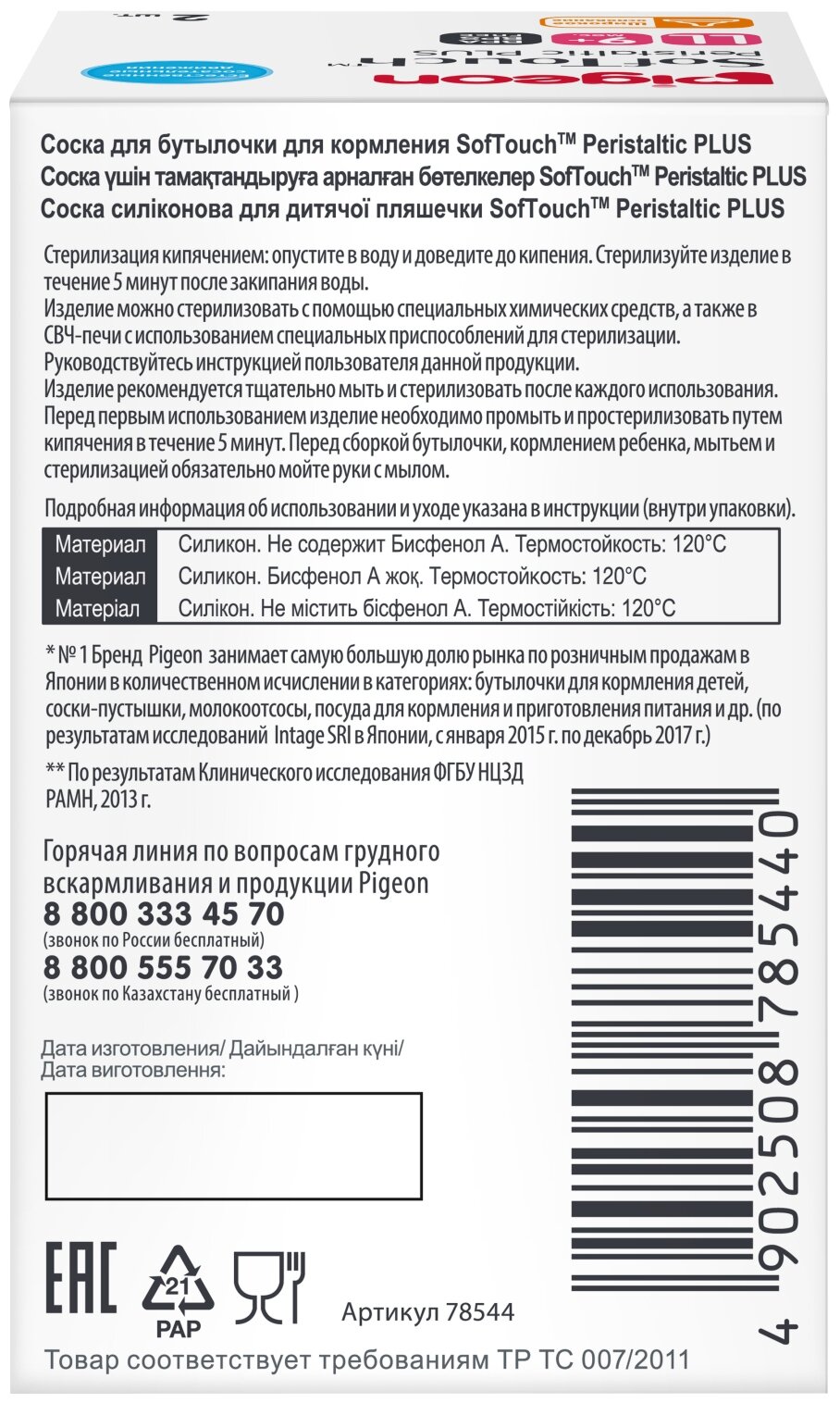 Соска силиконовая Pigeon SofTouch Peristaltic Plus размер L 2 шт 9+ мес .