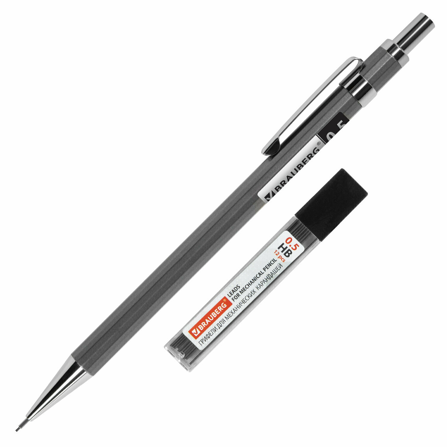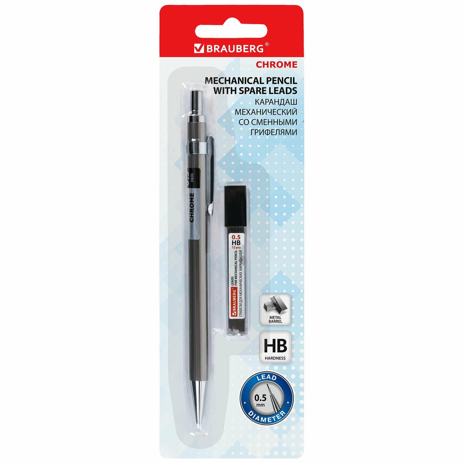 Купить Механический карандаш 0,5 мм + грифели Hb 12 штук на блистере, Brauberg Chrome, 181969
