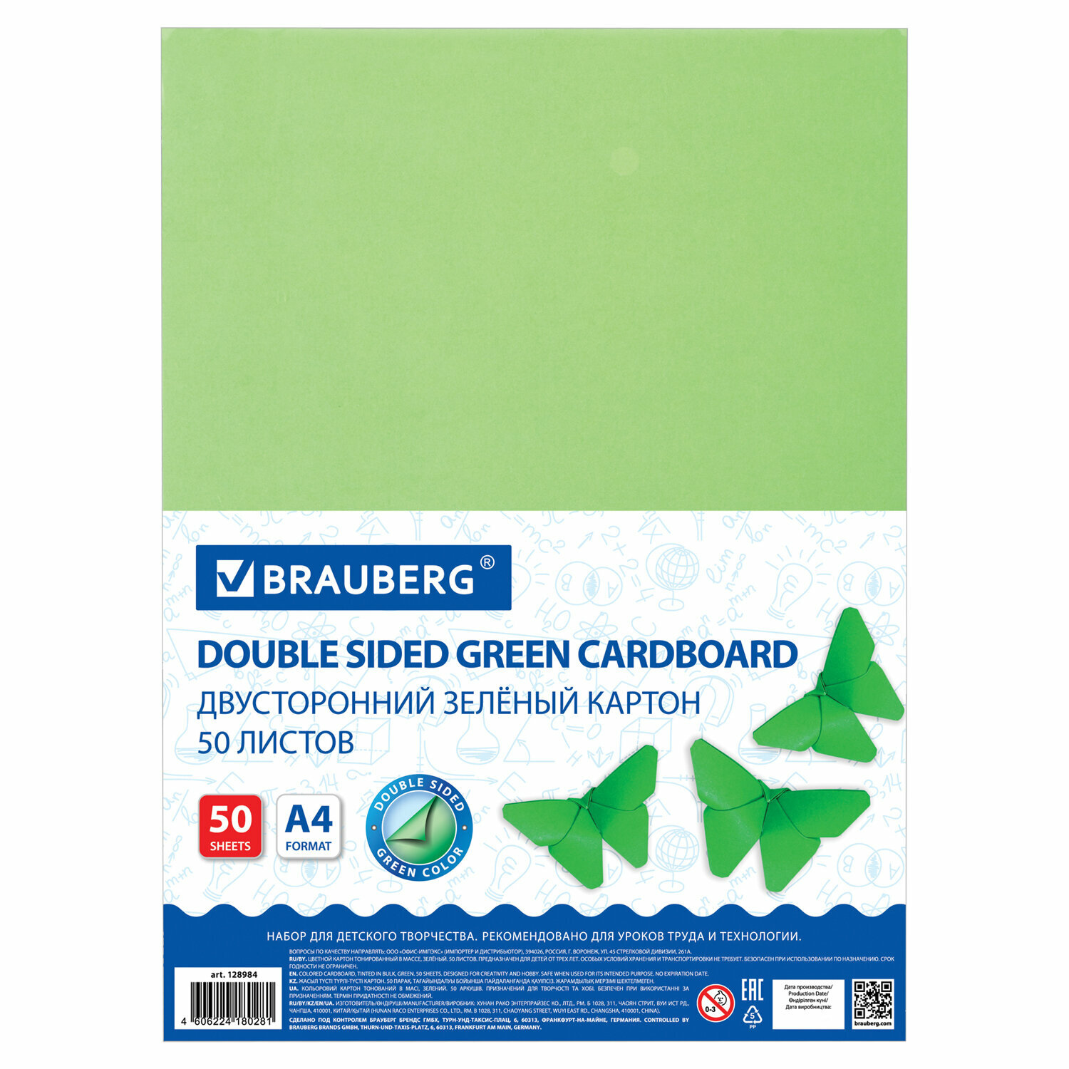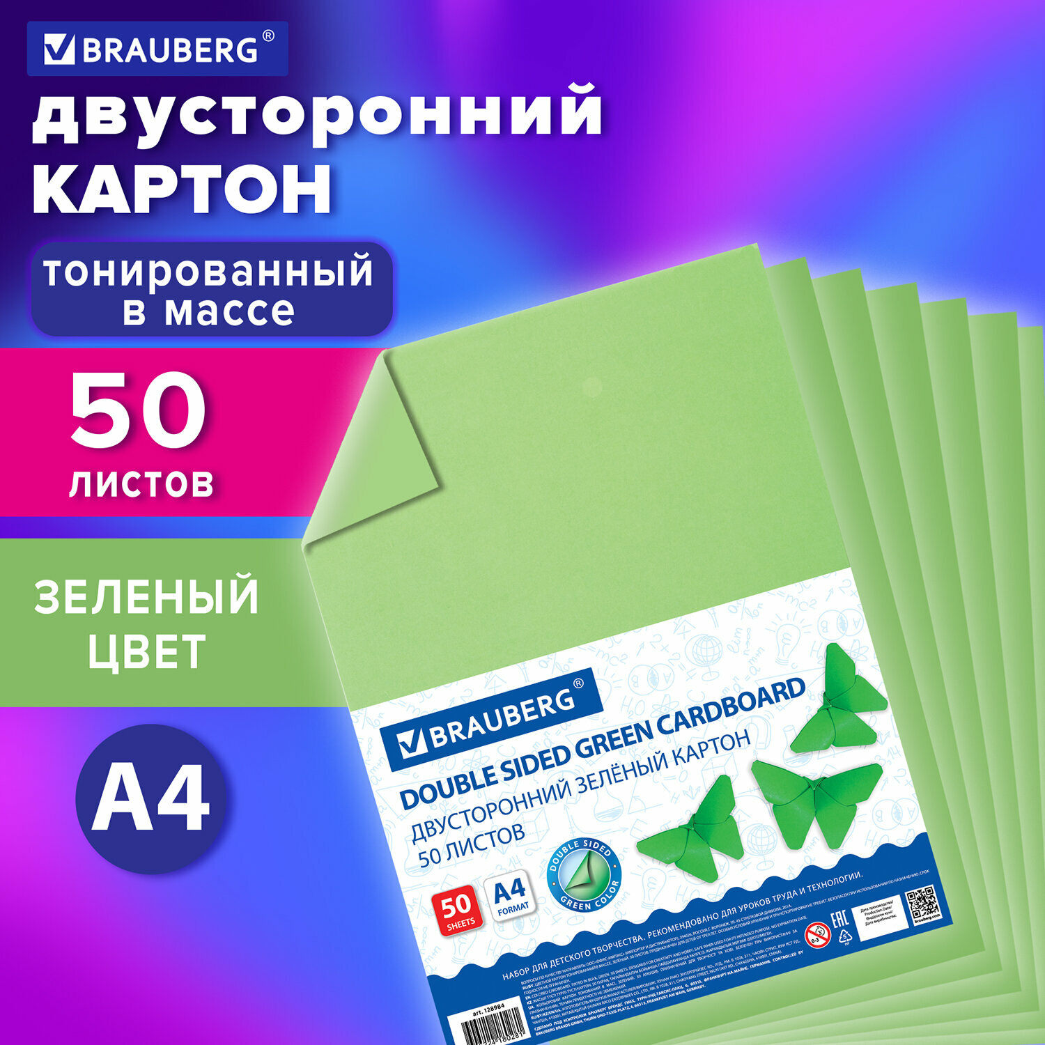 Картон цветной двусторонний Brauberg (50 листов, зеленый, тонированный, А4) (128984)
