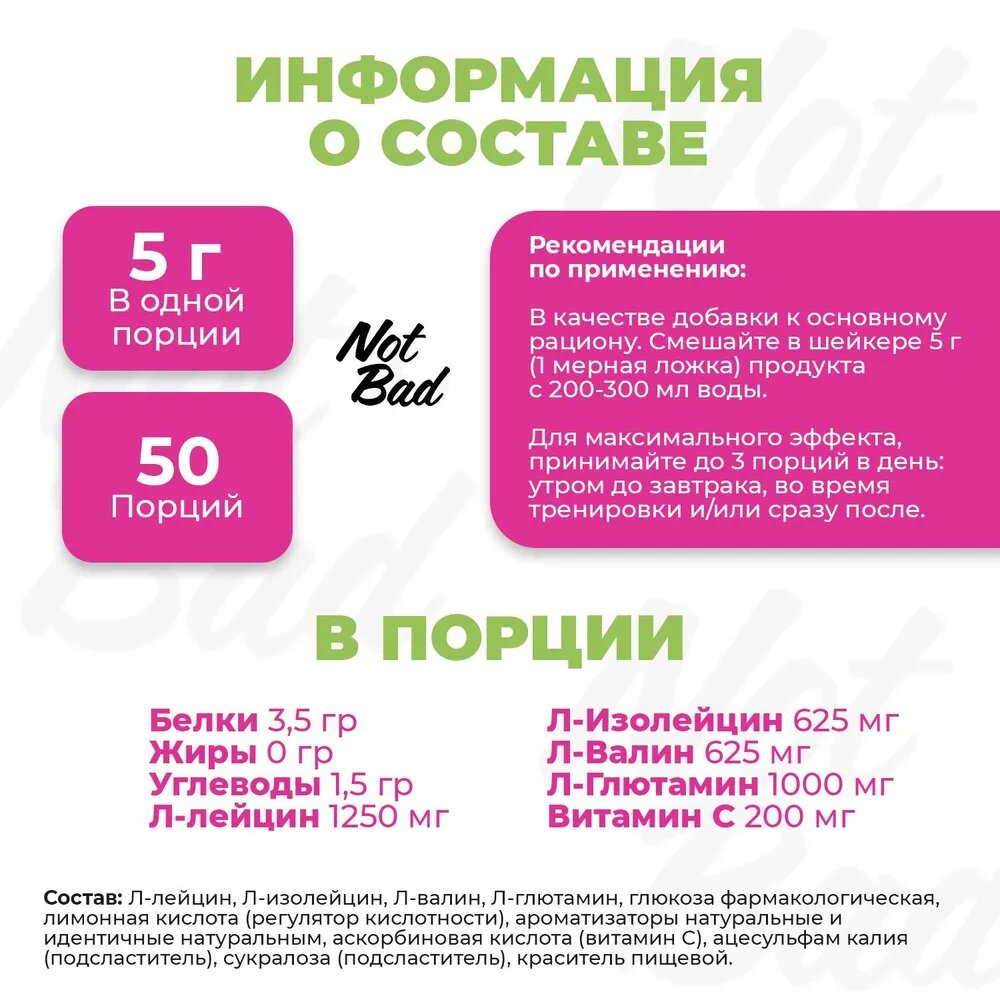 Аминокислоты комплекс NotBad BCAA 2:1:1 с глютамином, 250 гр, 50 порций, порошок, Розовый лимонад