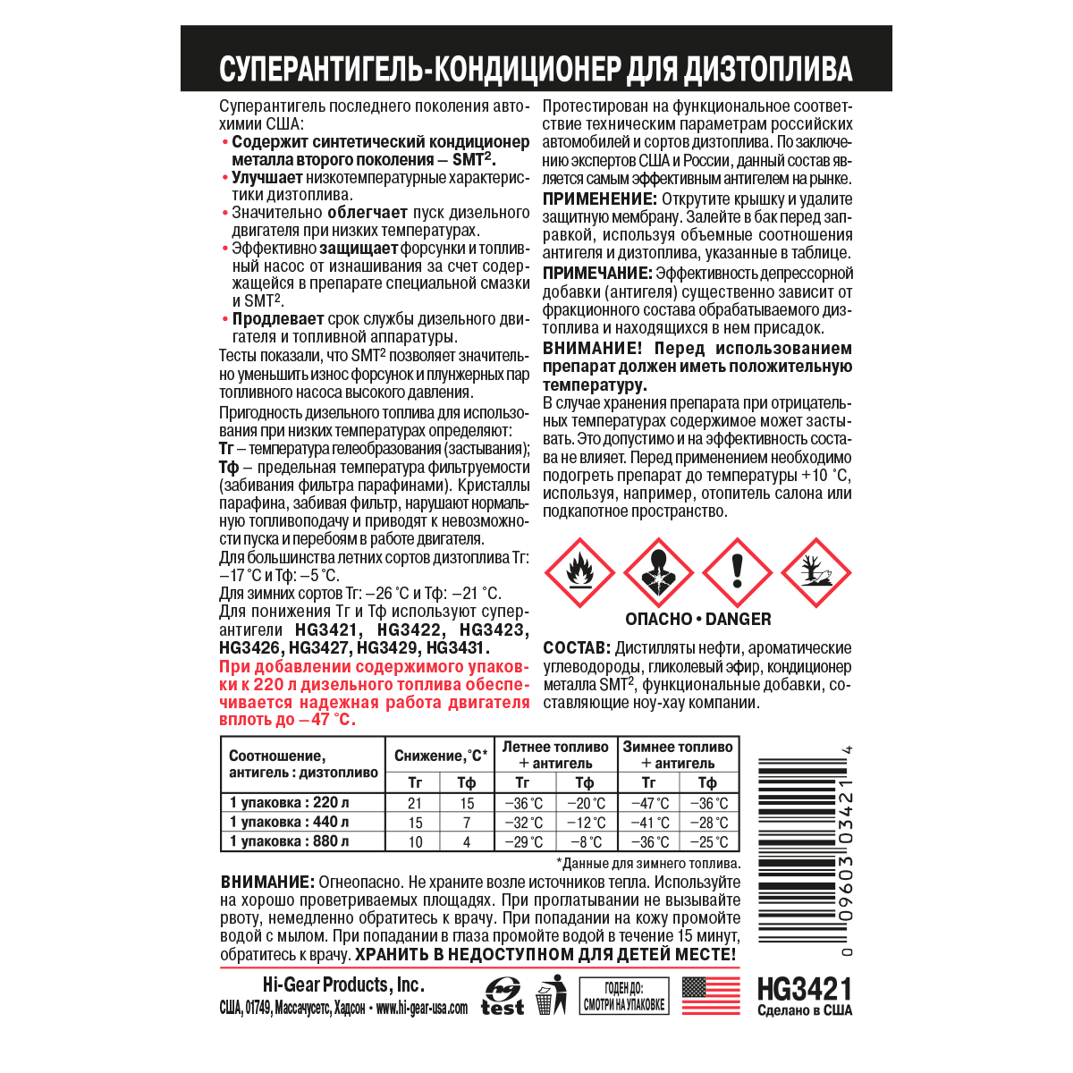 HI-GEAR HG3421 HG3421_суперантигель для дизтоплива (кондиционер), с SMT2 ! страна происх. США\ 1шт