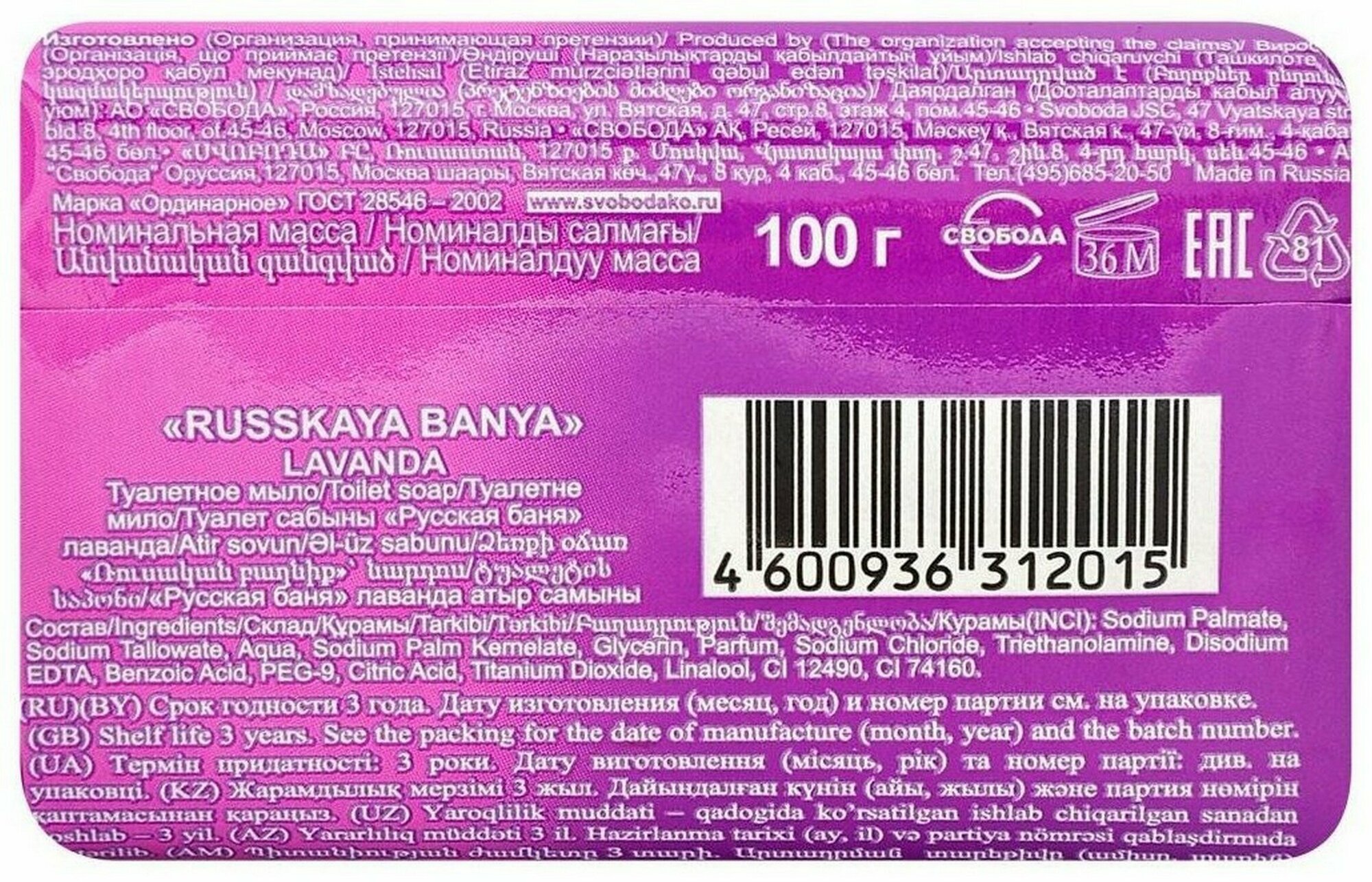 Туалетное мыло, Свобода, русская баня, лаванда, 100 г, 12 шт