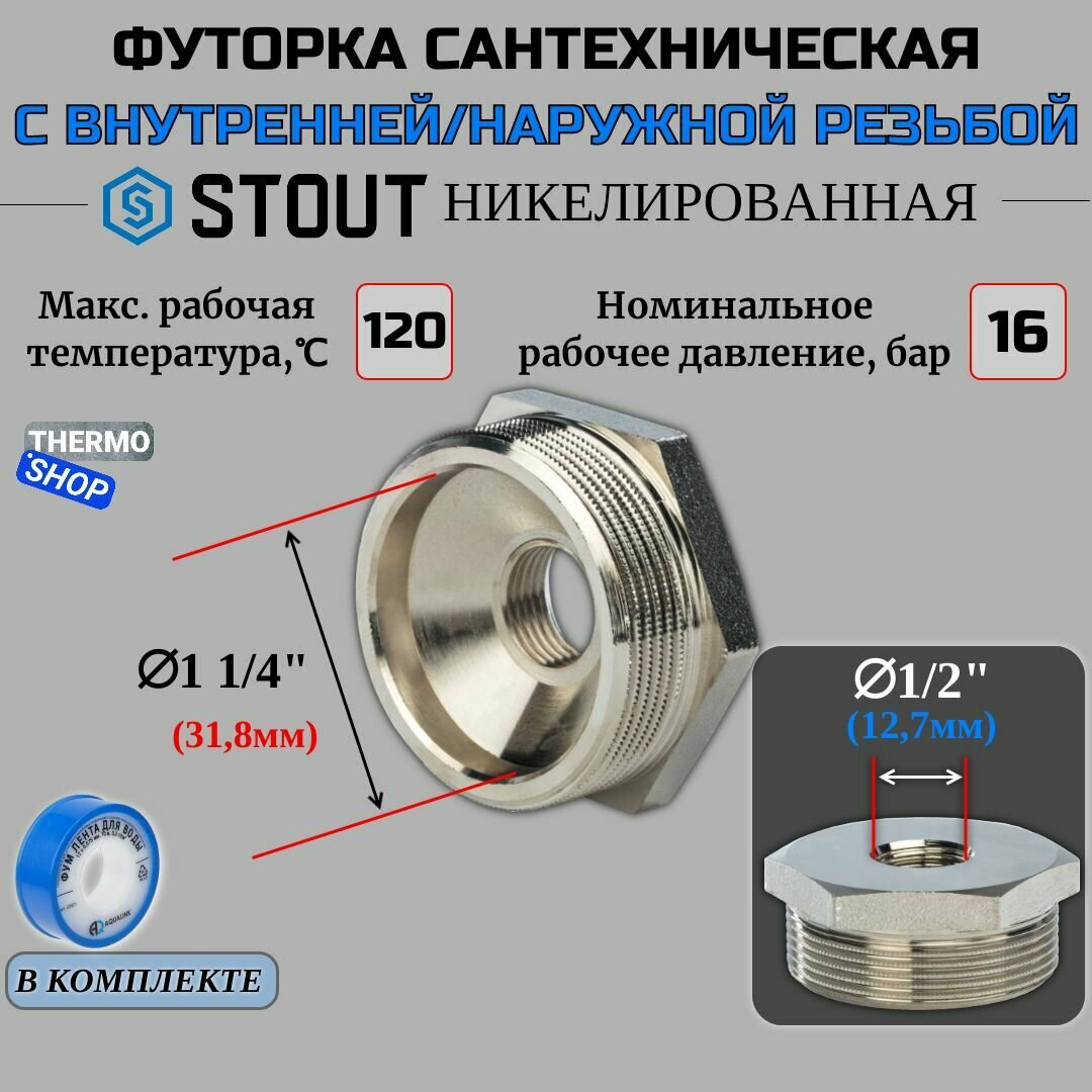 Ниже Вы можете прочитать отзывы на STOUT Футорка НВ 1 1/4" x 1/2" никелированная, ознакомится с подробными характеристиками, посмотреть интересные обзоры и фотографии на STOUT Футорка НВ 1 1/4" x 1/2" никелированная.