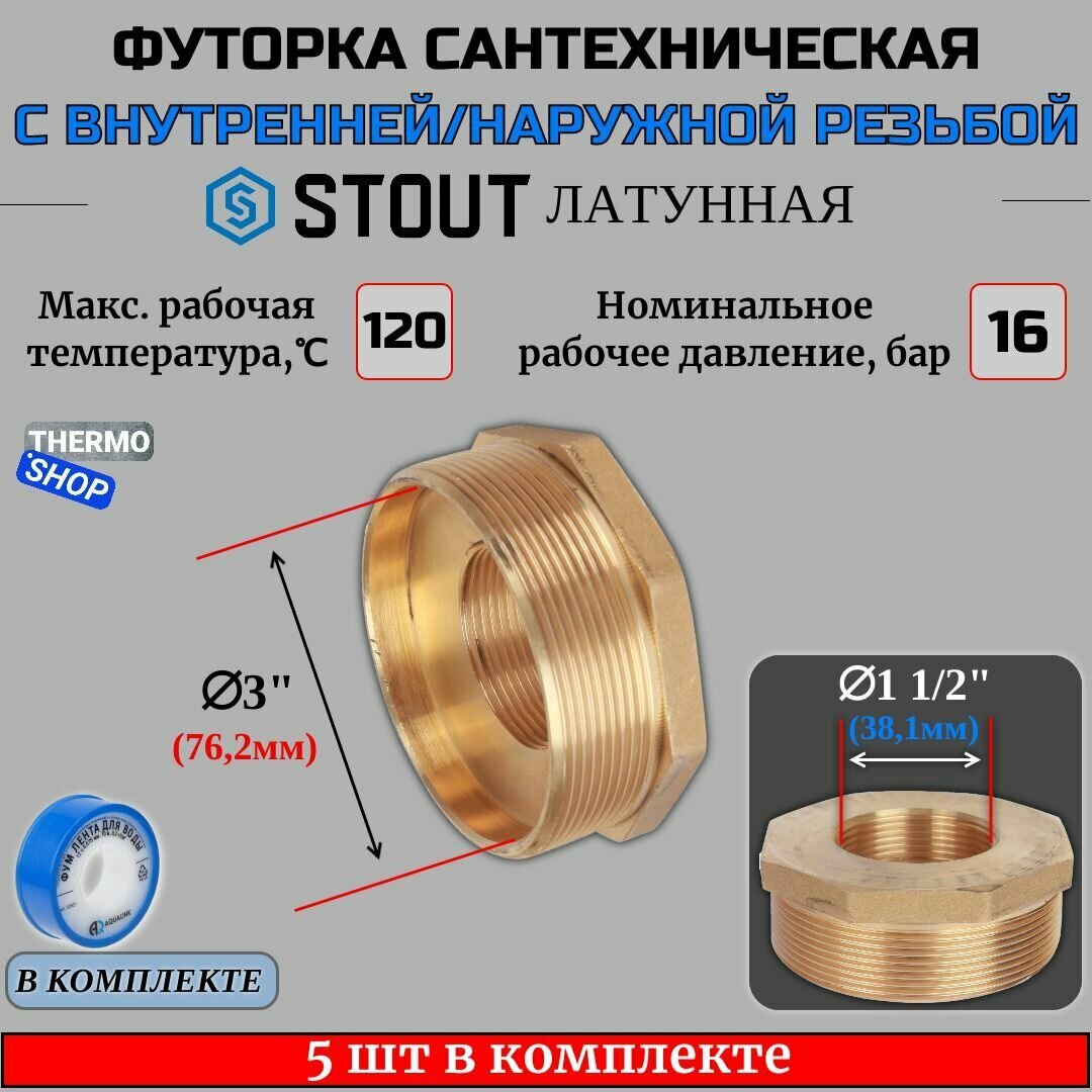 Купить Футорка латунная 3"X1"1/2 5 шт сантехническая для труб, ФУМ лента 10 м