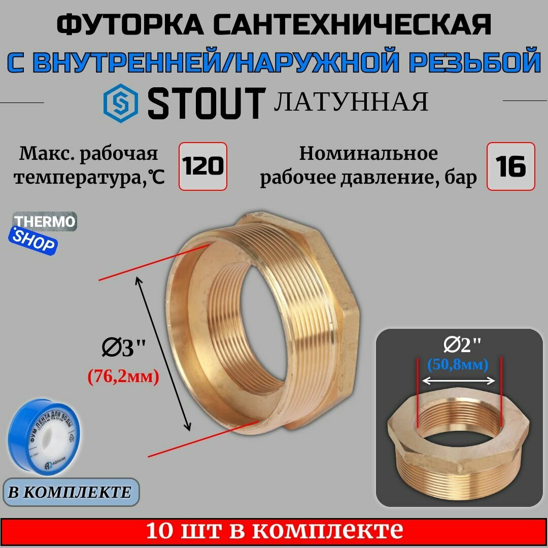Футорка латунная 3"X2"1/2 10 шт сантехническая для труб, ФУМ лента 10 м