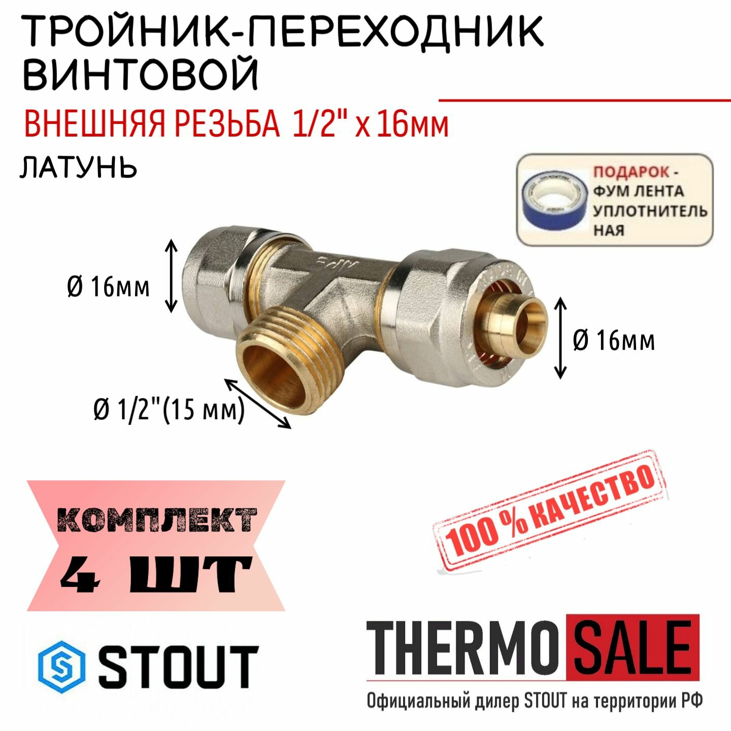 Купить Тройник-переходник с ВР 1/2"х16 4 шт для металлопластиковых труб винтовой ФУМ лента
