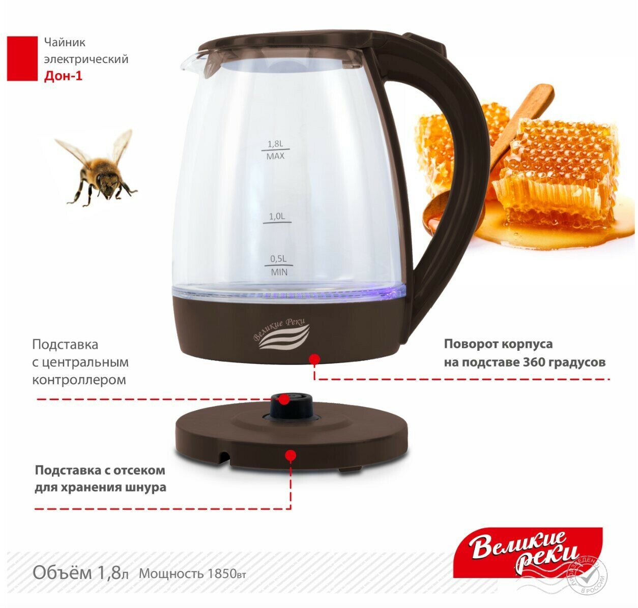 Чайник электрический Великие Реки Дон-1 1,8л, стекло, коричневый, 1850Вт (8)