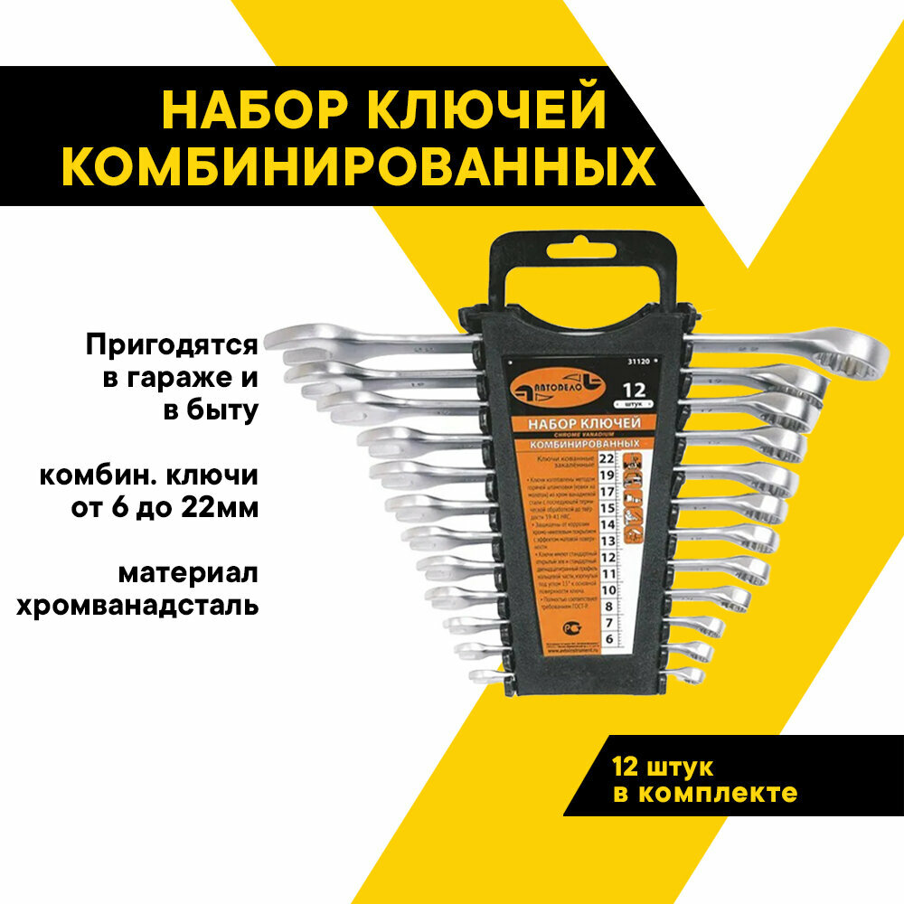 Набор комбинированных ключей Автодело, от 6мм до 22мм, 12 предметов, с держателем, арт. АД-31120 Стандарт