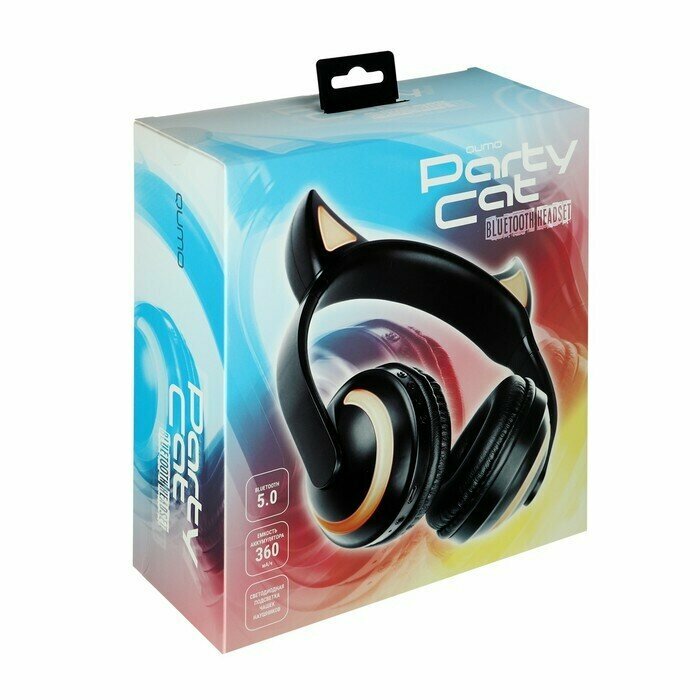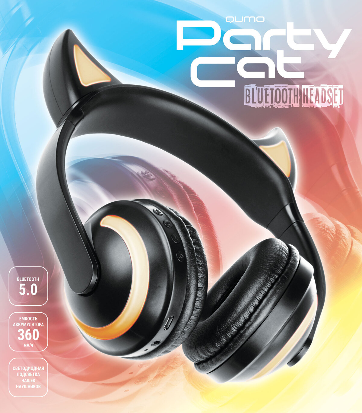 Наушники Qumo Party Cat (ВТ 0024), черный + "ушки" с подсветкой, накладная, Bluetooth 4.2