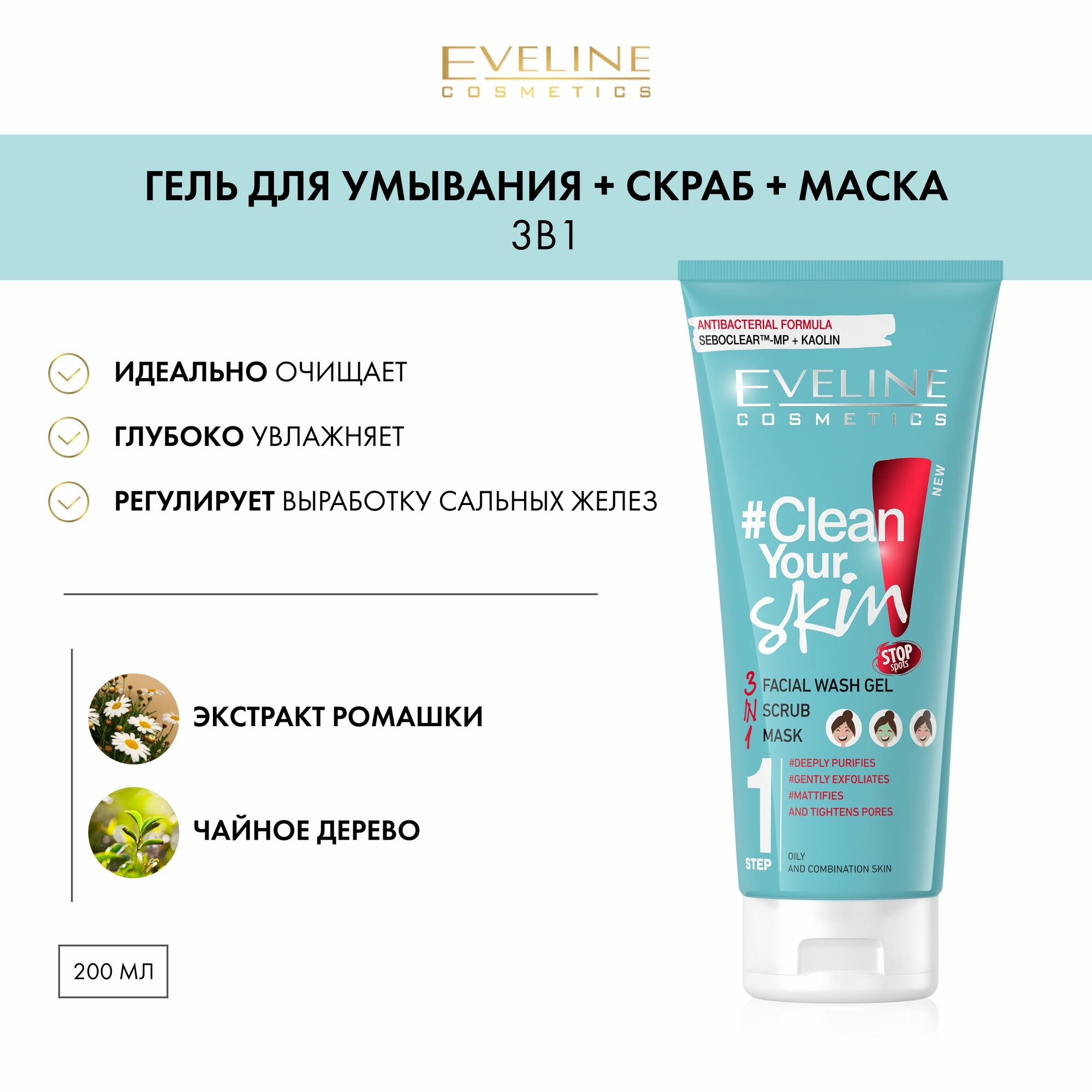 Гель для умывания-скраб-маска EVELINE Clean Your Skin 3в1, для комб.и жирной кожи, 200 мл