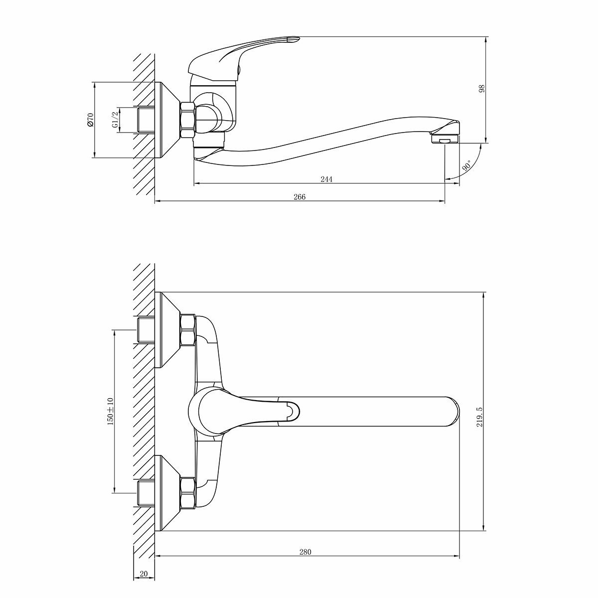 ROSSINKA A35-24, Смеситель для кухонной мойки одноручный (35 мм), настенный с нижним изливом, хром