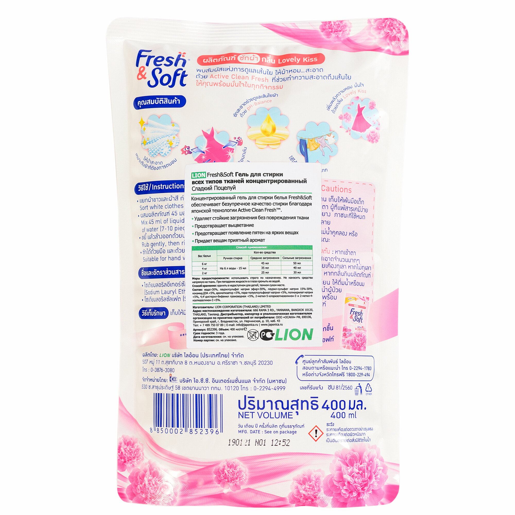 Lion fresh soft гель для стирки всех типов тканей концентрированный, сладкий поцелуй, мягкая упаковка, 400 мл