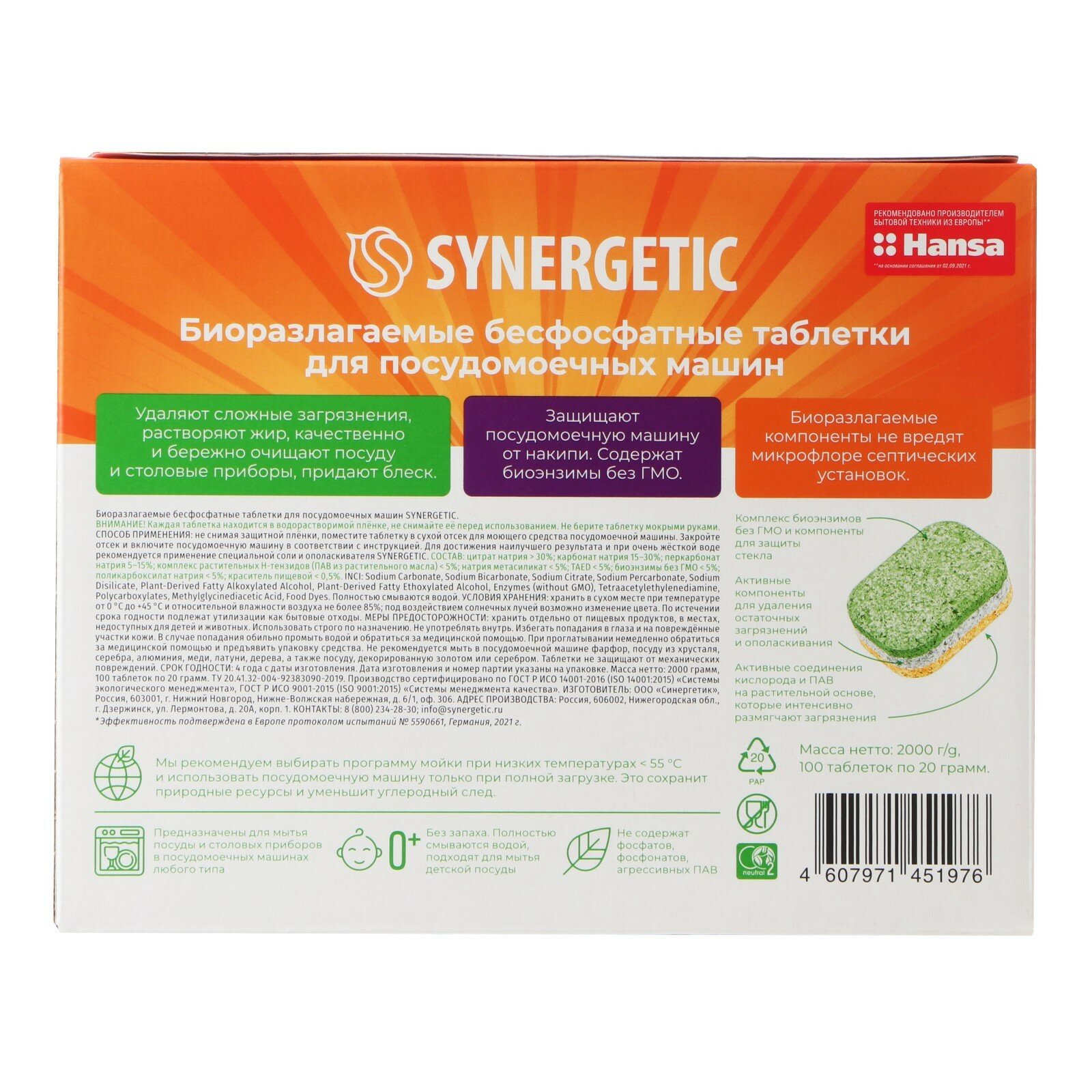 Биоразлагаемые бесфосфатные экологичные таблетки для посудомоечной машины SYNERGETIC 4607971451976 102100