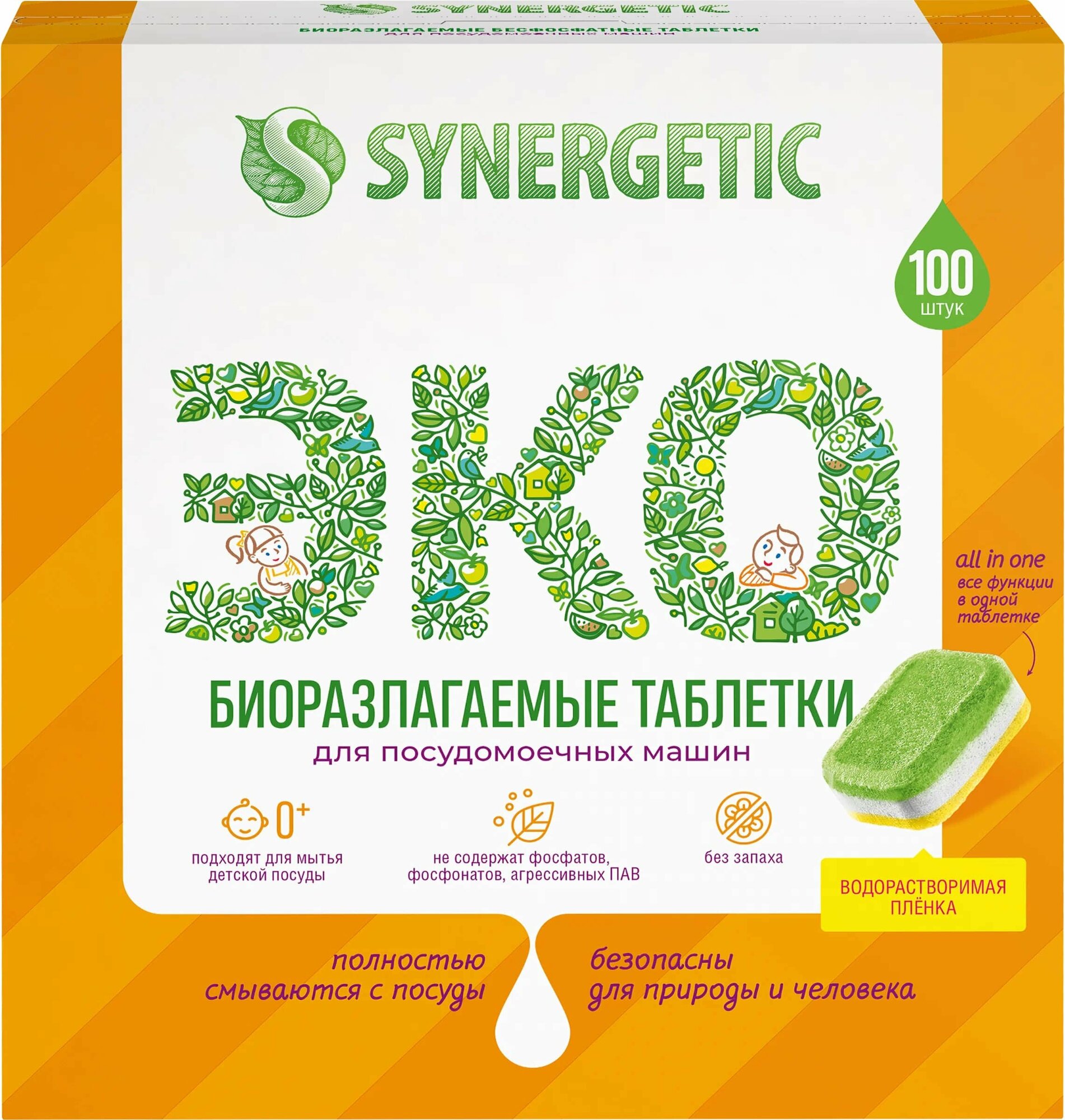 Таблетки для посудомоечных машин бесфосфатные Synergetic, без запаха, 100 шт