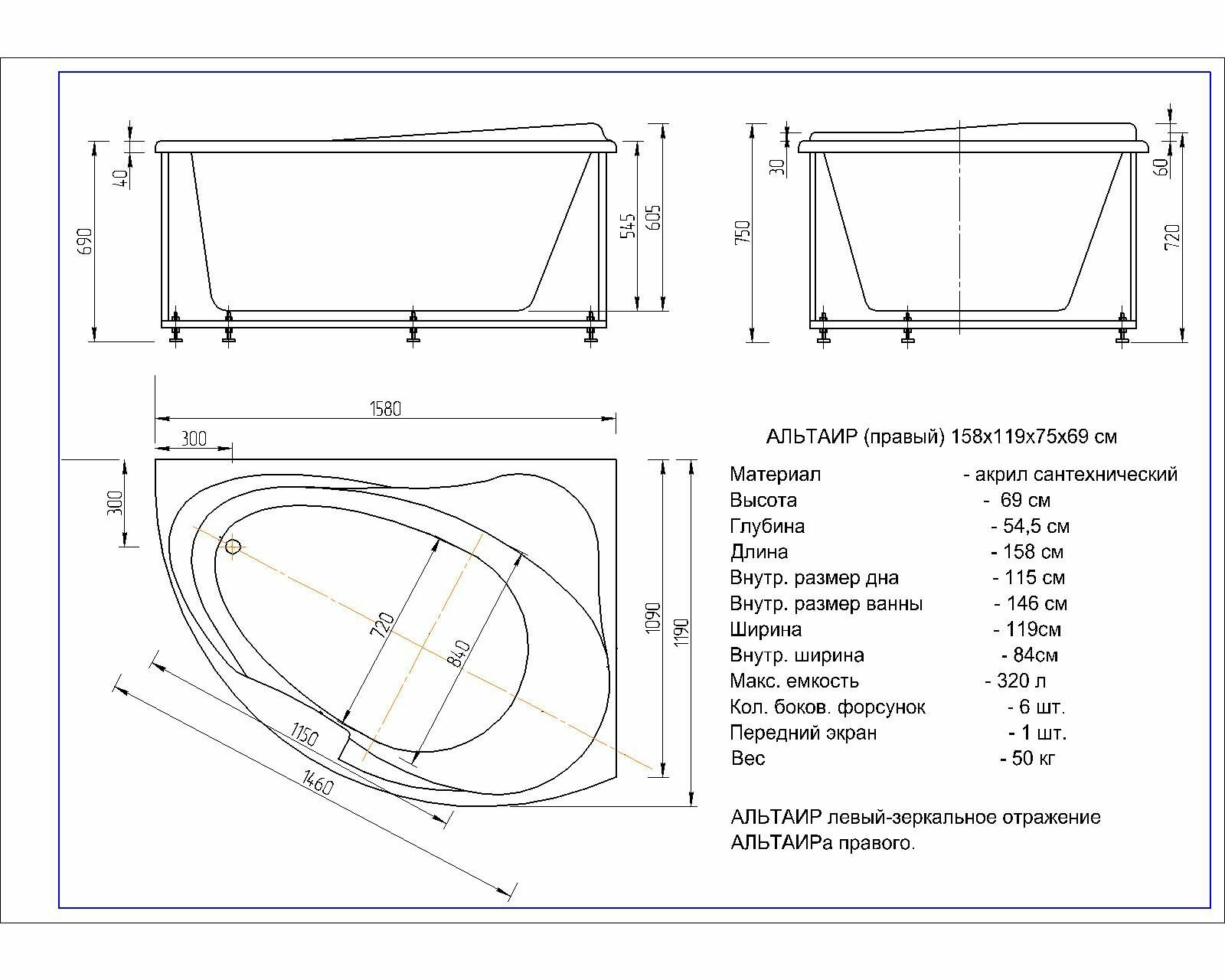 Акриловая ванна Aquatek Альтаир 158x119 L ALT160-0000067 без гидромассажа с фронтальной панелью с каркасом (вклеенный) со слив-переливом