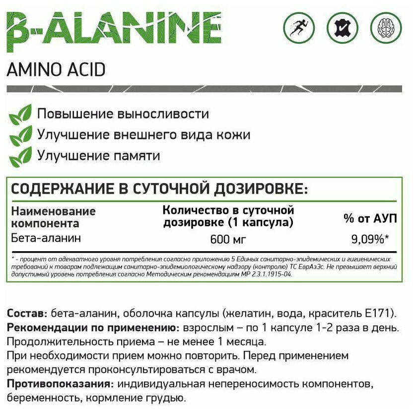 Купить Бета-аланин 600 мг / Для выносливости, для кожи, для памяти / 60 капс. NaturalSupp