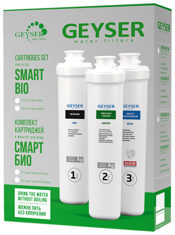 Комплект картриджей Гейзер Смарт Био 511, для мягкой воды, 100% удаление бактерий и вирусов, уникальная технология очистки и минерализации, 50103