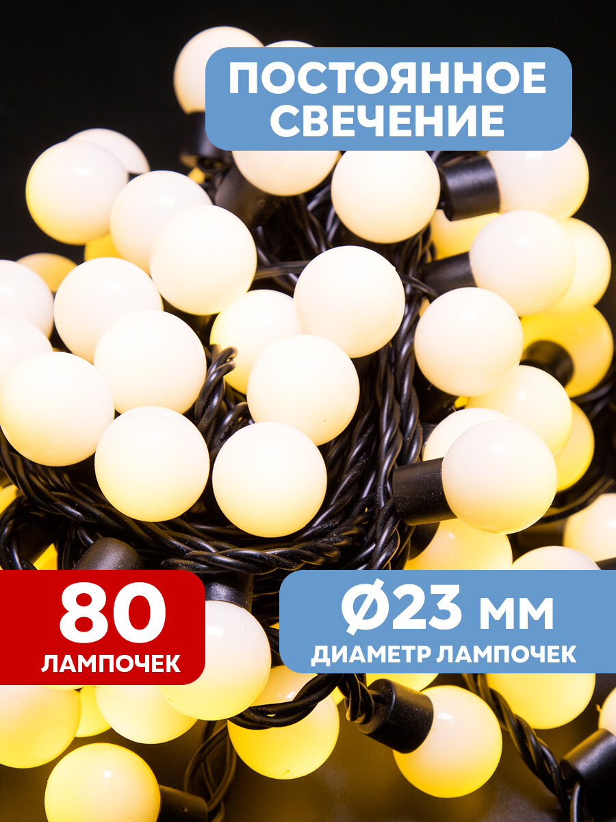 Гирлянда Мультишарики Ø23 мм, 10 м, черный ПВХ, 80 диодов, цвет теплый белый